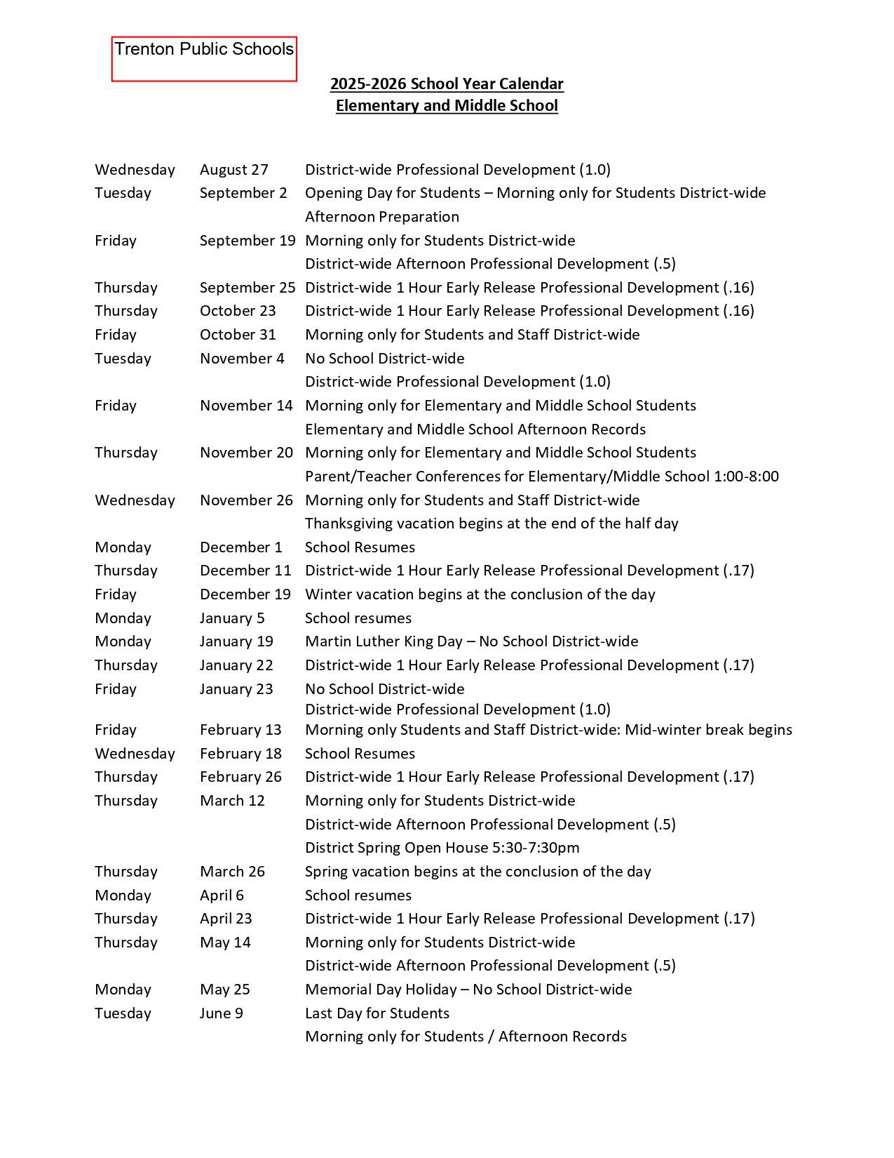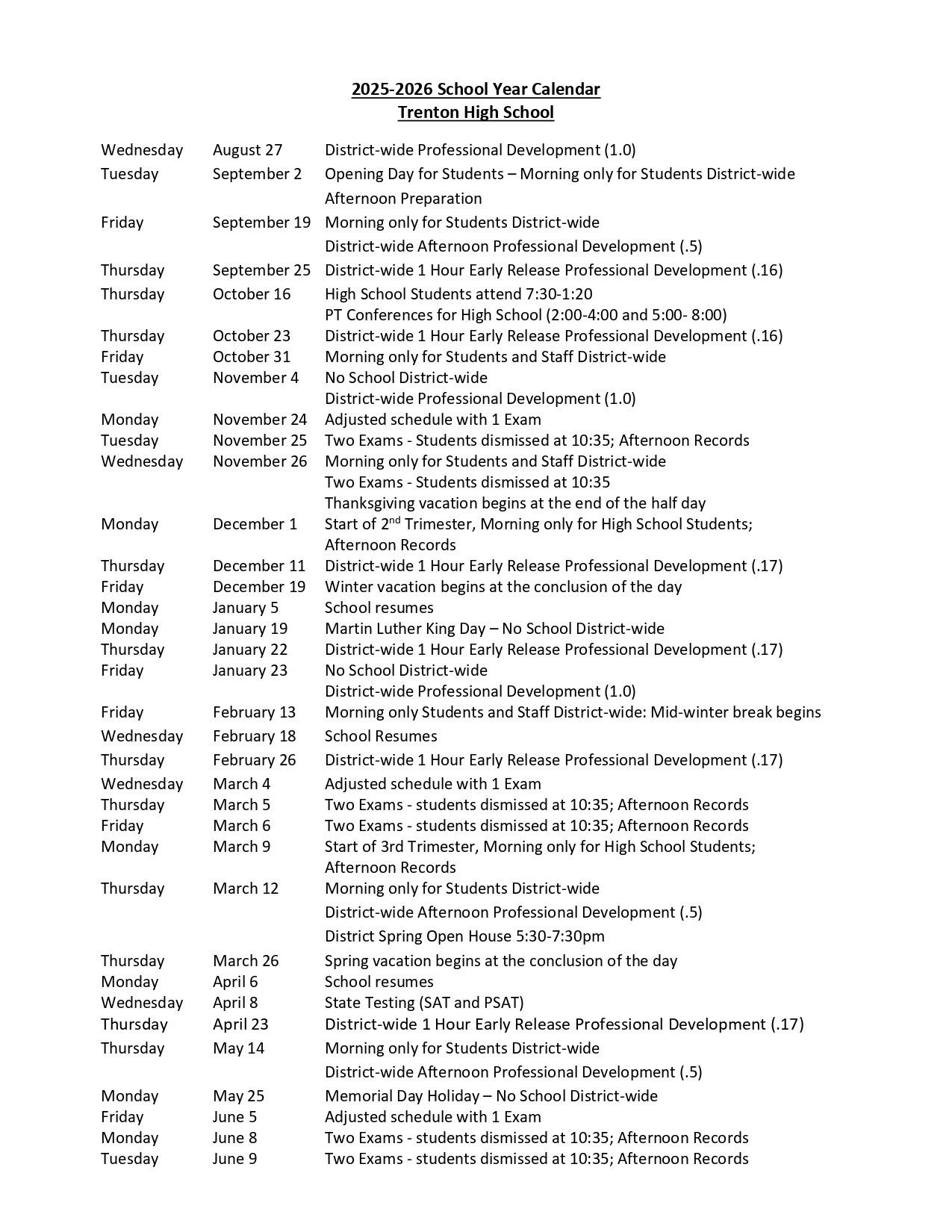 The school calendar provided on this page is taken from the official Trenton Public Schools MI Michigan School District website. Please note that all dates and events are subject to change at the discretion of the school district. For the most accurate and updated information, please refer to the official district website or contact the school helpline.