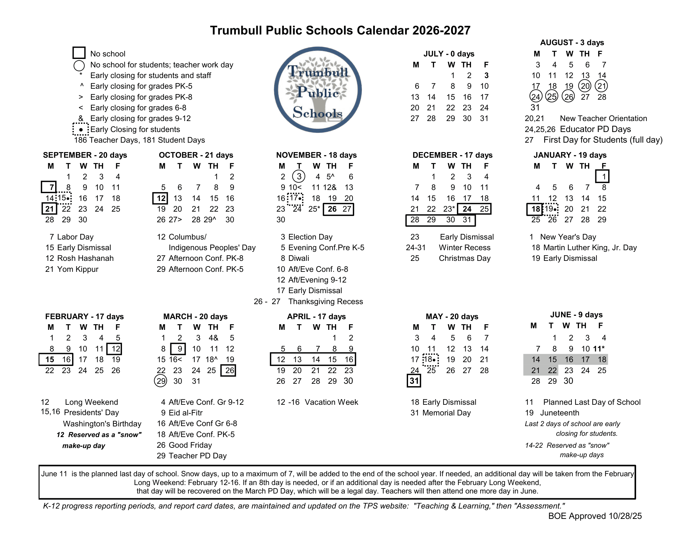 Dates are sourced from the official Trumbull Public Schools Calendar 26-27 Updated [PDF] website. Dates may change at the discretion of the district. Always verify with the official school website for the latest updates.