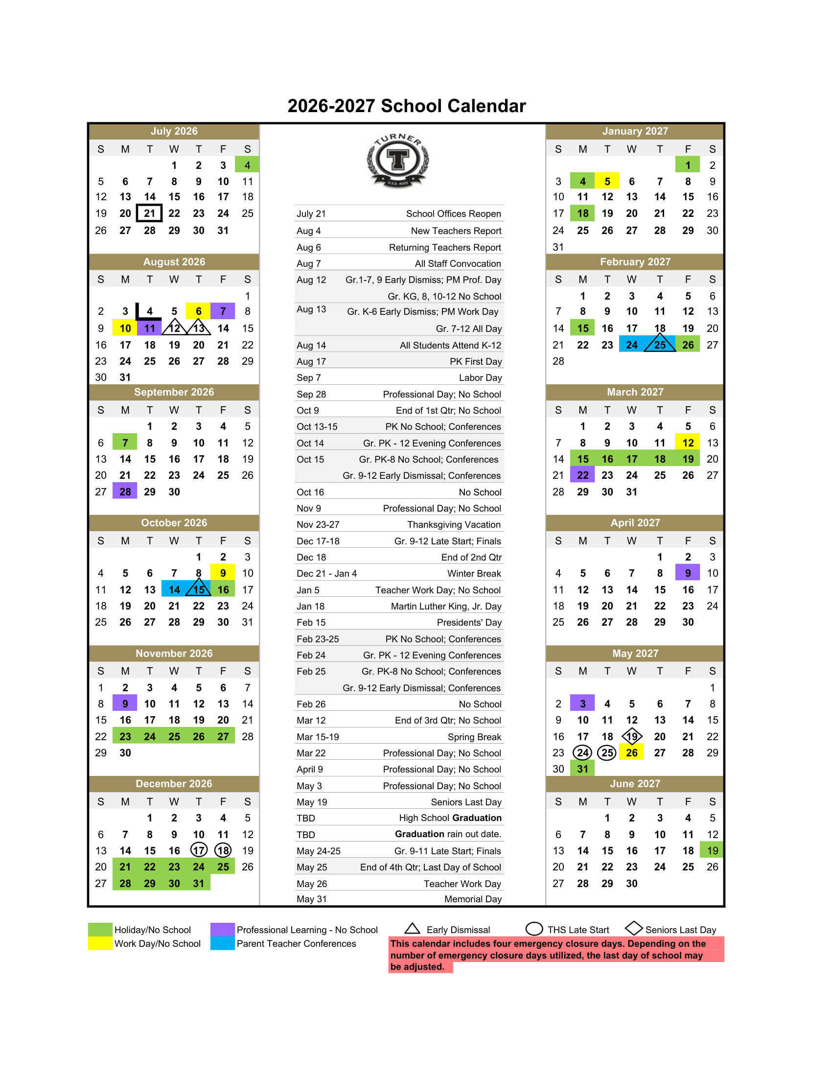 Dates are sourced from the official Turner USD 202 26-27 Calendar Updated website. Dates may change at the discretion of the district. Always verify with the official school website for the latest updates.