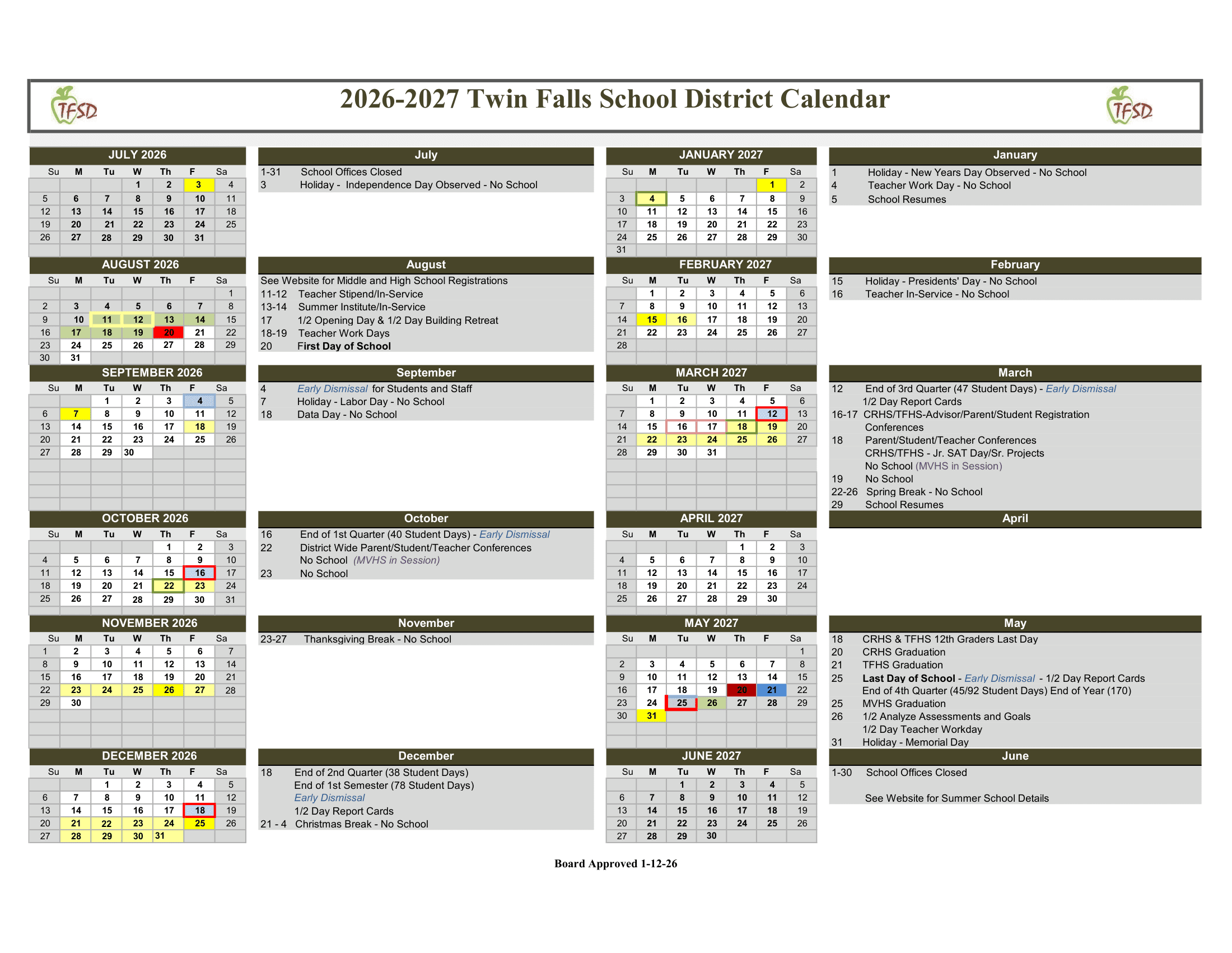 Dates are sourced from the official Twin Falls School District 26-27 Calendar [PDF] website. Dates may change at the discretion of the district. Always verify with the official school website for the latest updates.