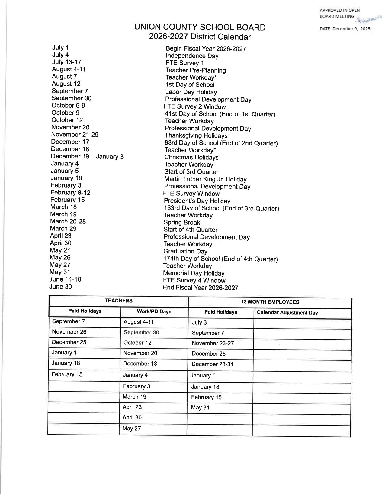 UNION COUNTY SCHOOL BOARD 2026-2027 District Calendar FAQ