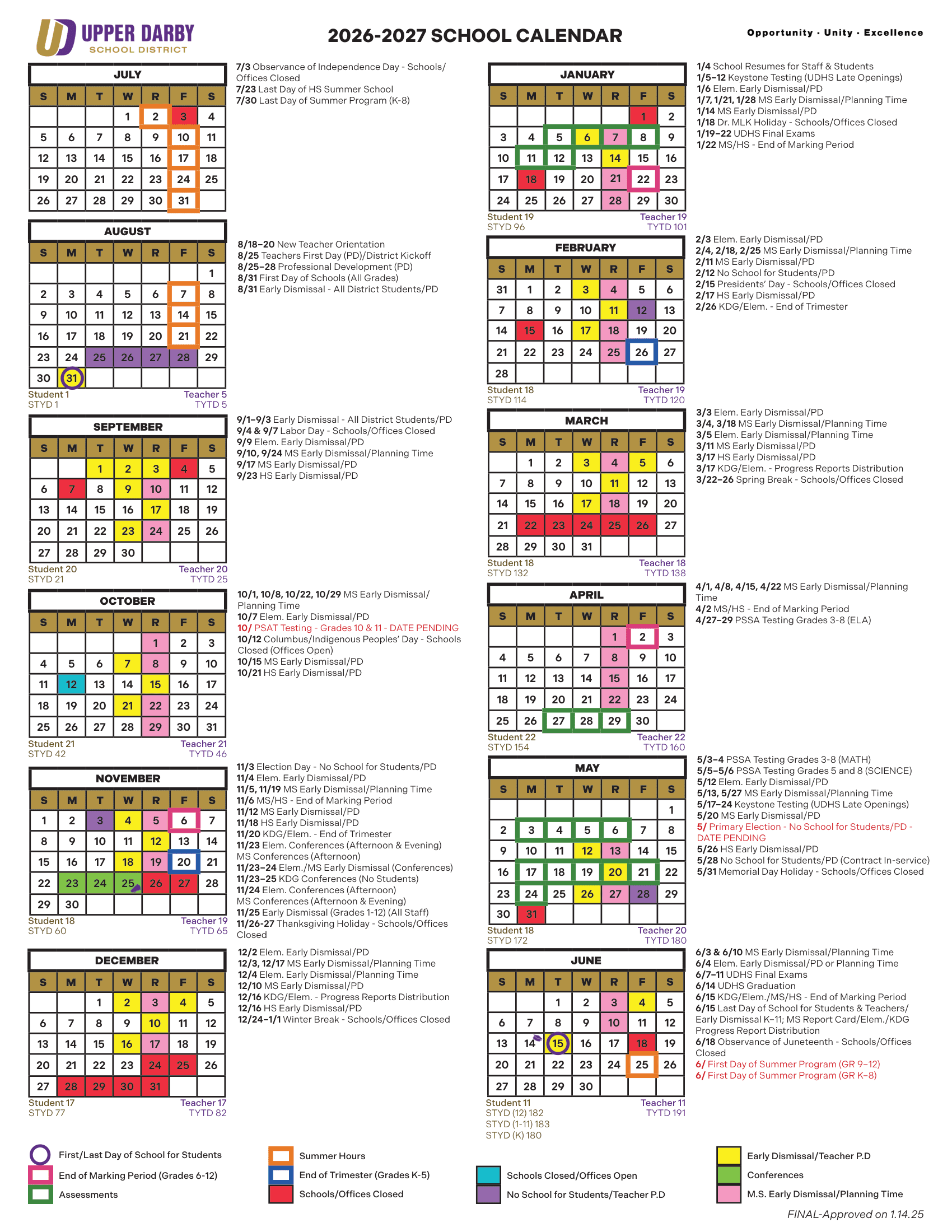 Dates are sourced from the official Upper Darby School District 26-27 Calendar Updated [PDF] website. Dates may change at the discretion of the district. Always verify with the official school website for the latest updates.