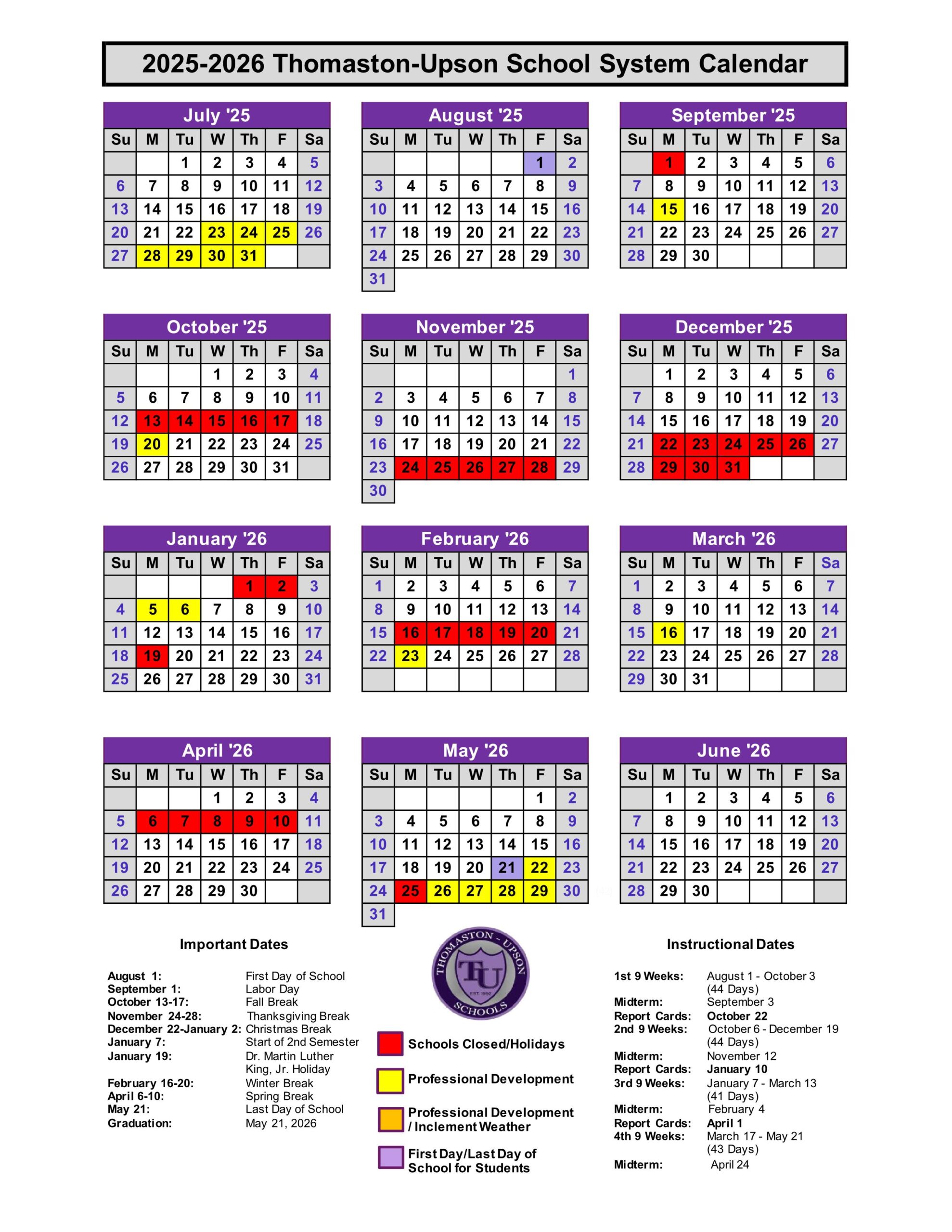 The school calendar provided on this page is taken from the official Upson County GA School District website. Please note that all dates and events are subject to change at the discretion of the school district. For the most accurate and updated information, please refer to the official district website or contact the school helpline.