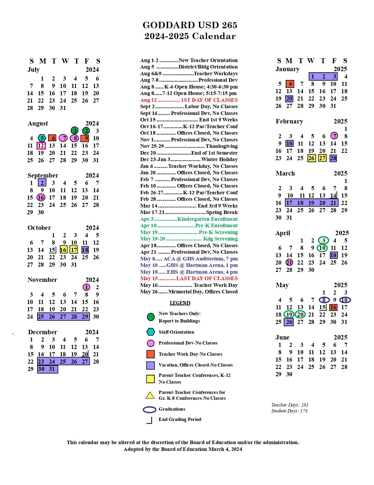 The printable school calendar provided on this page is taken from the official USD 265 Goddard Public Calendar website. Please note that all dates and events are subject to change at the discretion of the school district. For the most accurate and updated information, please refer to the official district website or contact the school helpline.