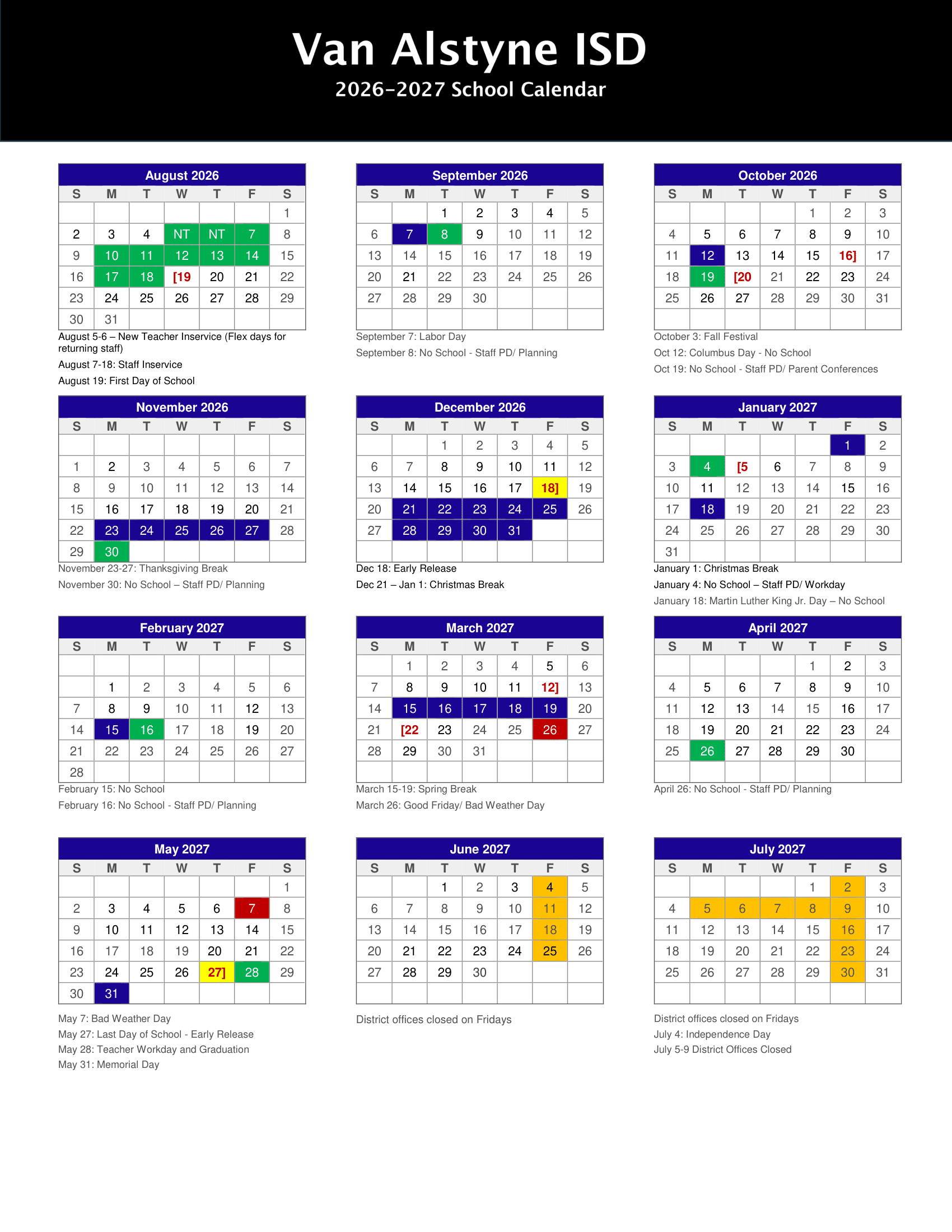 Dates are sourced from the official Van Alstyne ISD 26-27 calendar Revised [PDF] website. Dates may change at the discretion of the district. Always verify with the official school website for the latest updates.
