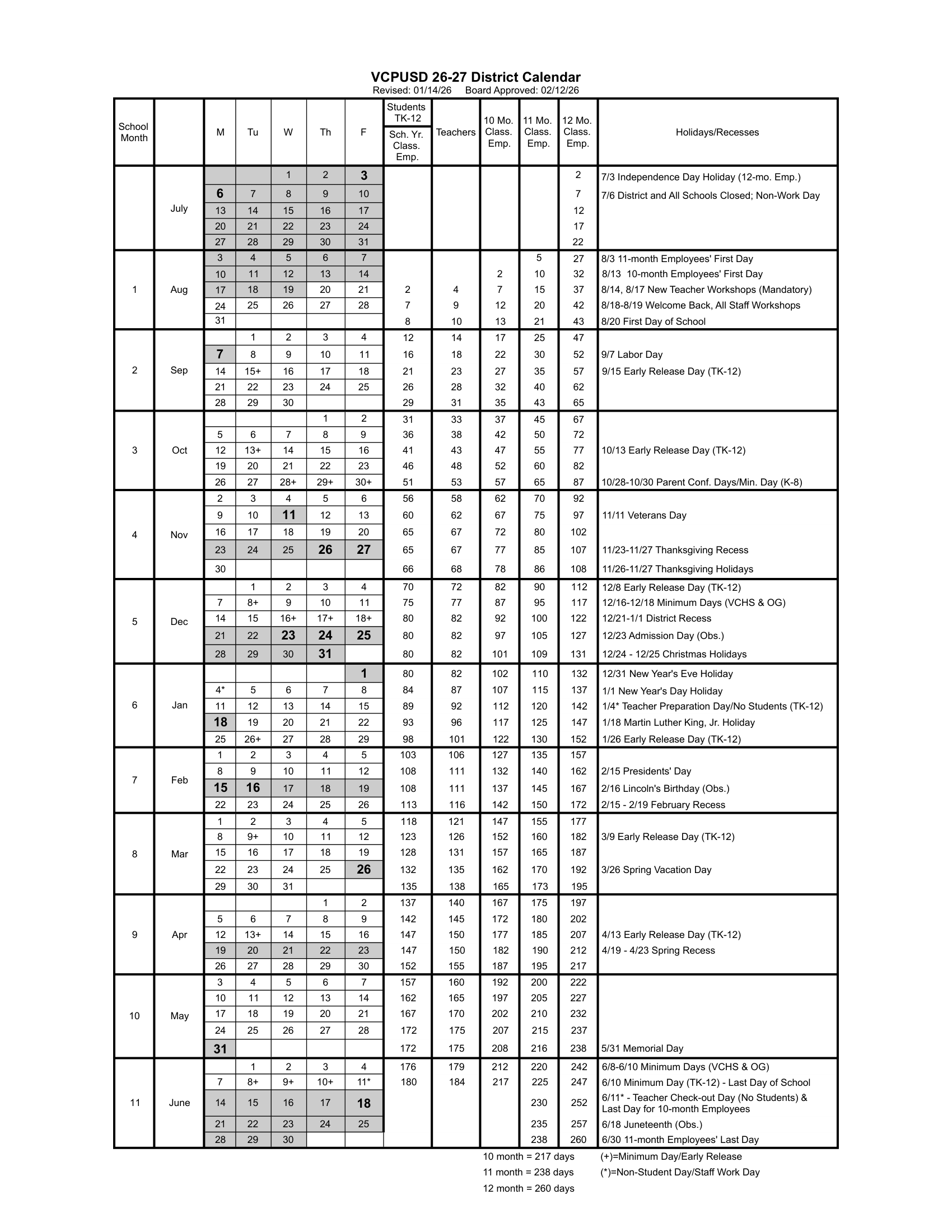 The first day of school for the VCPUSD 2026-2027 school year is August 20, 2026.