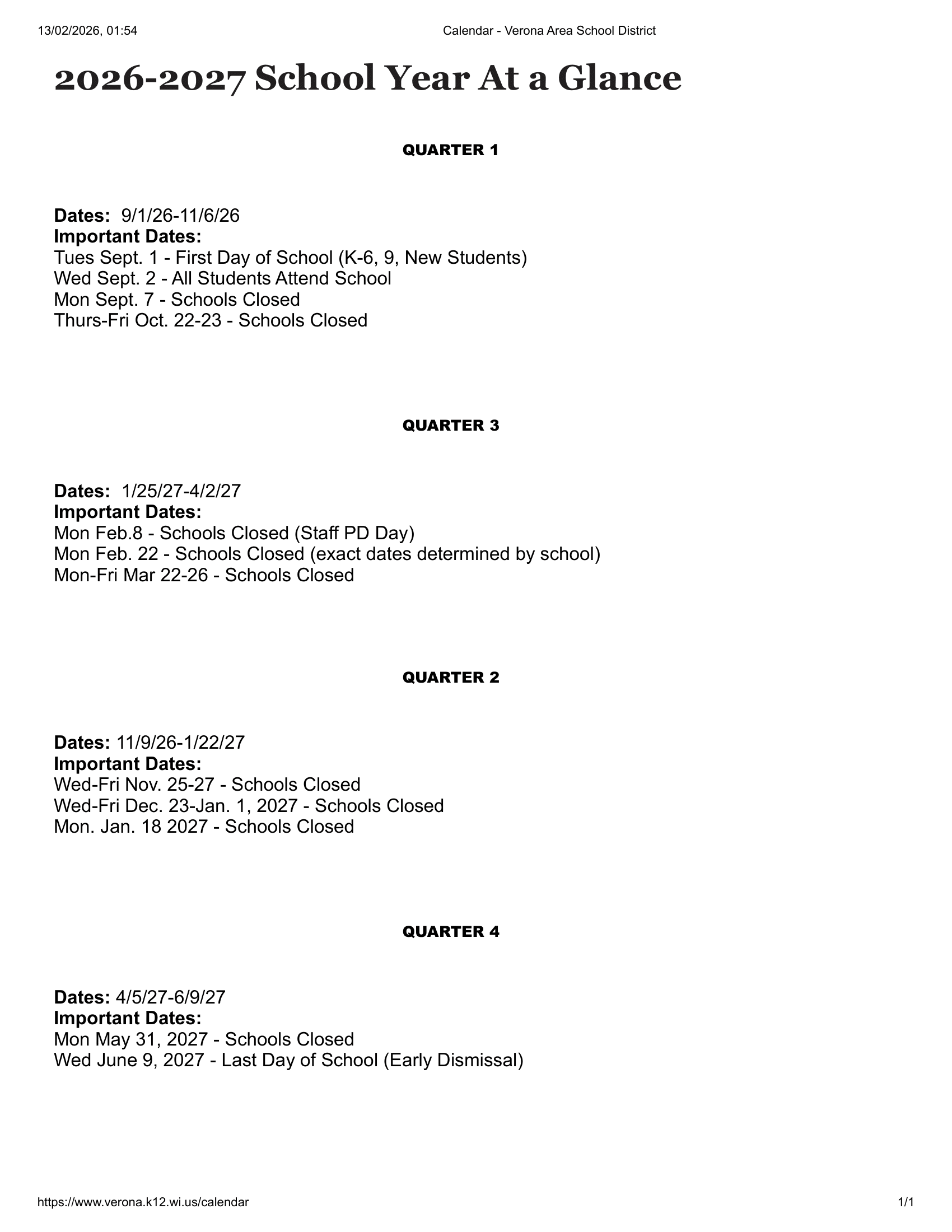 Dates are sourced from the official Verona Area School District 26-27 Updates website. Dates may change at the discretion of the district. Always verify with the official school website for the latest updates.