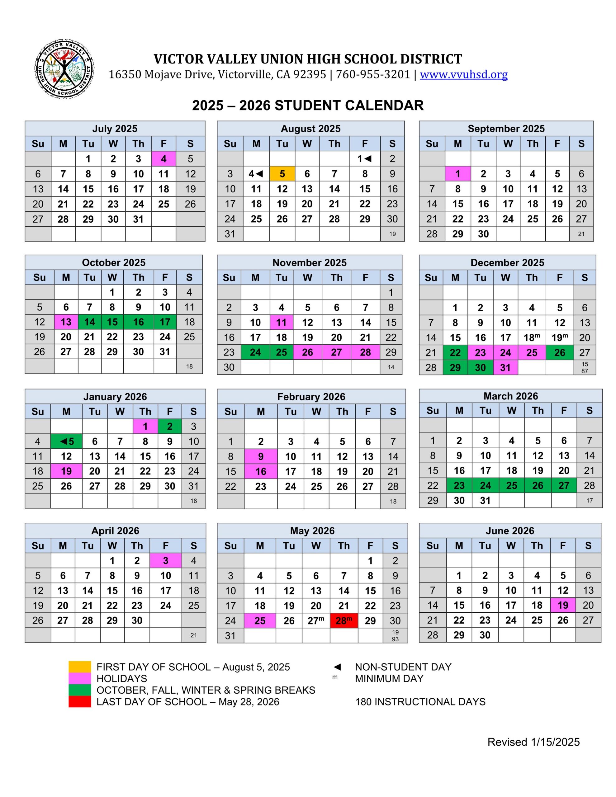 The school calendar provided on this page is taken from the official VVUHSD Victor Valley Unified School District website.