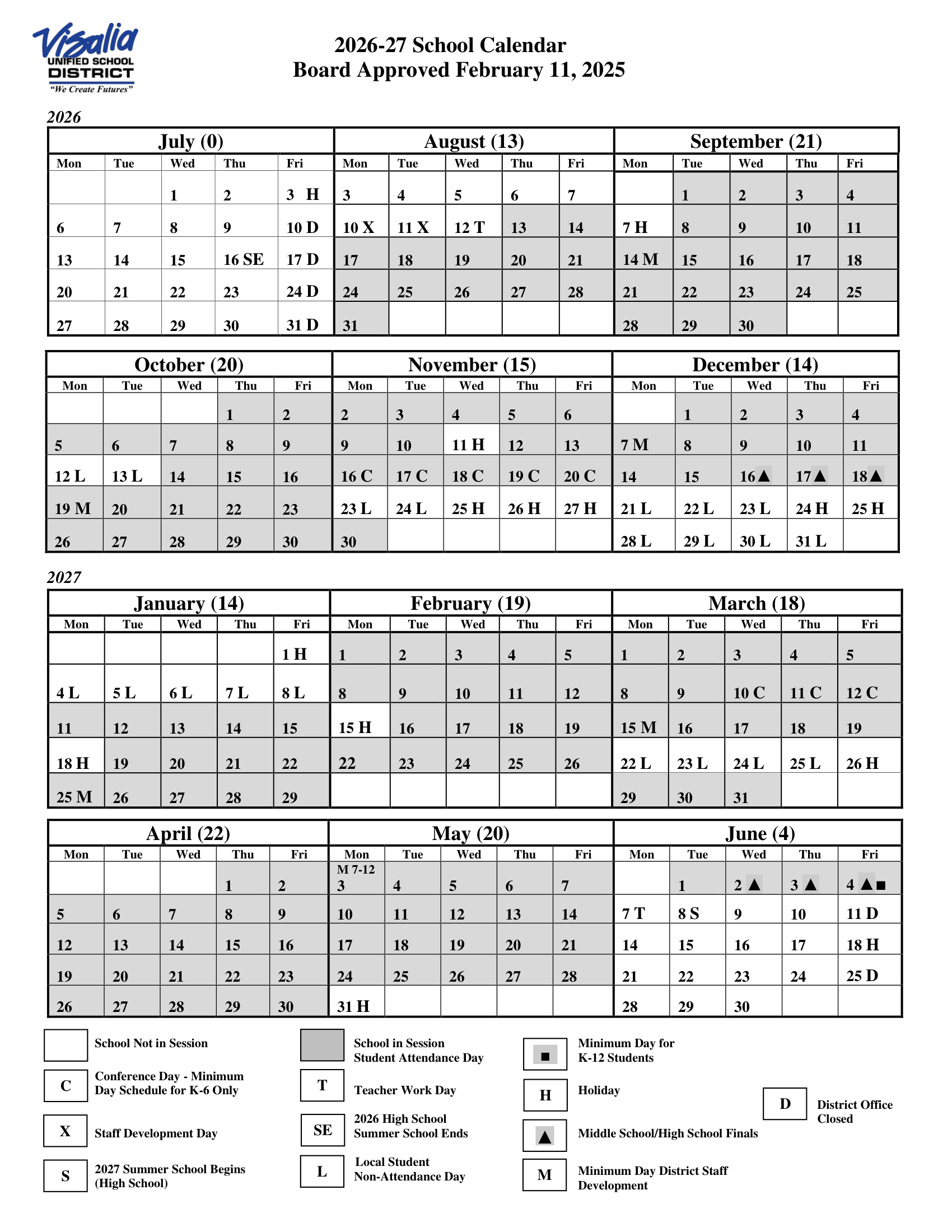 Visalia Unified School District Calendar (2026-2027)