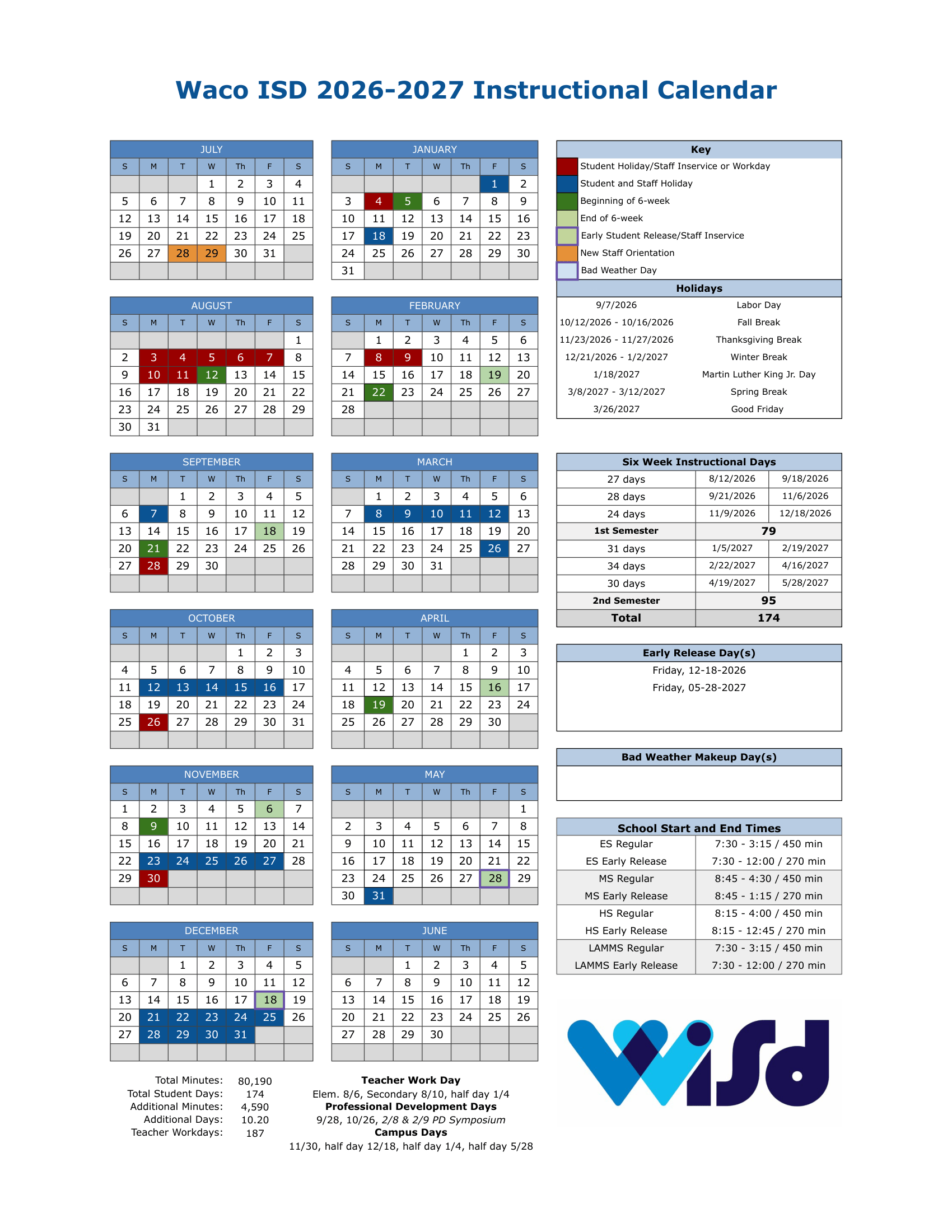 Waco ISD Calendar (2026-2027)