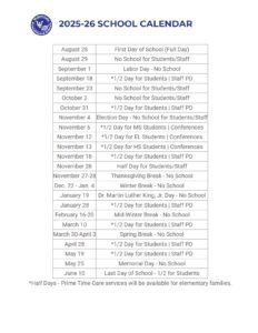 - No School for Students/Staff: August 29, September 23, and October 2, 2025