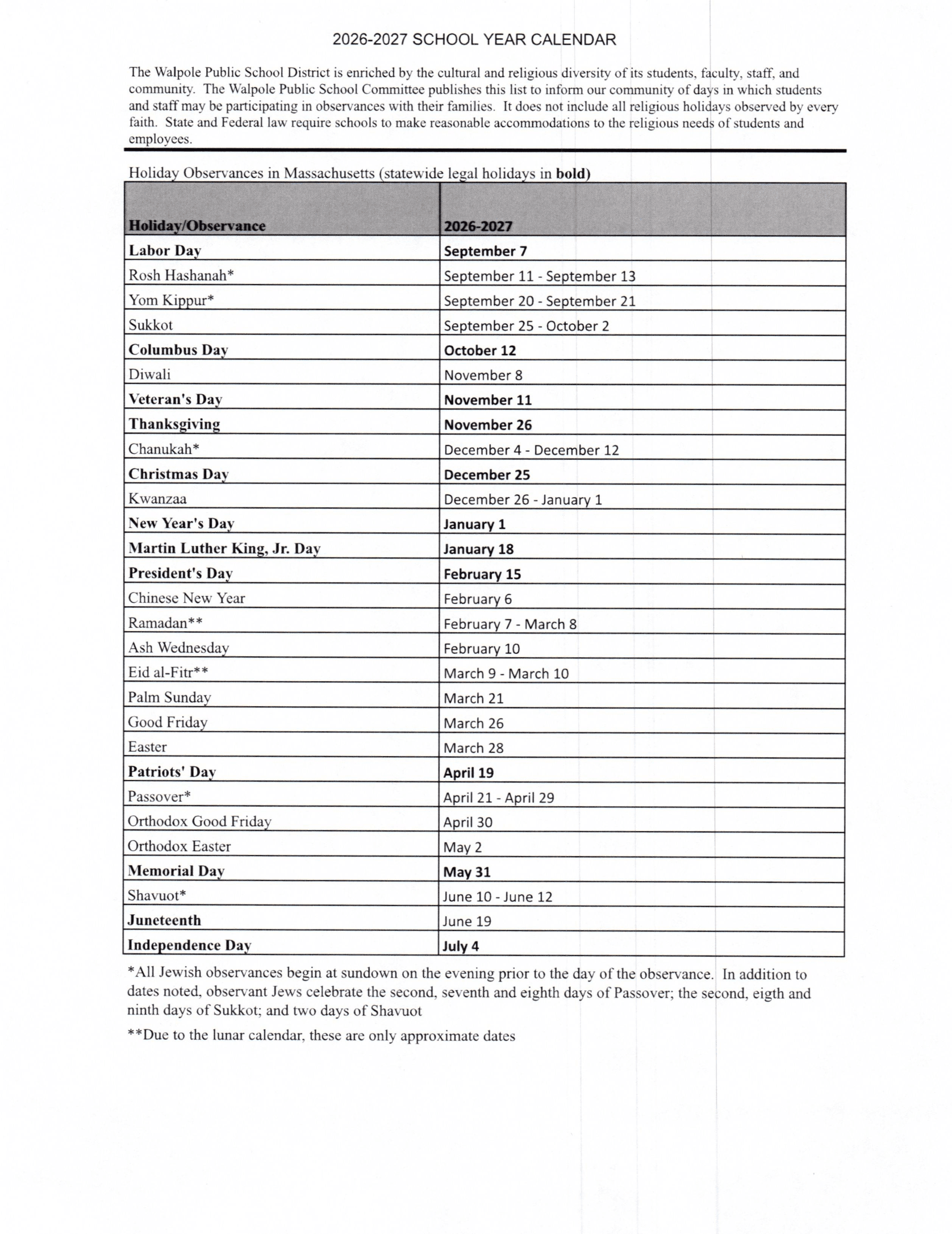 Walpole Public School District Calendar 2026-2027 FAQs