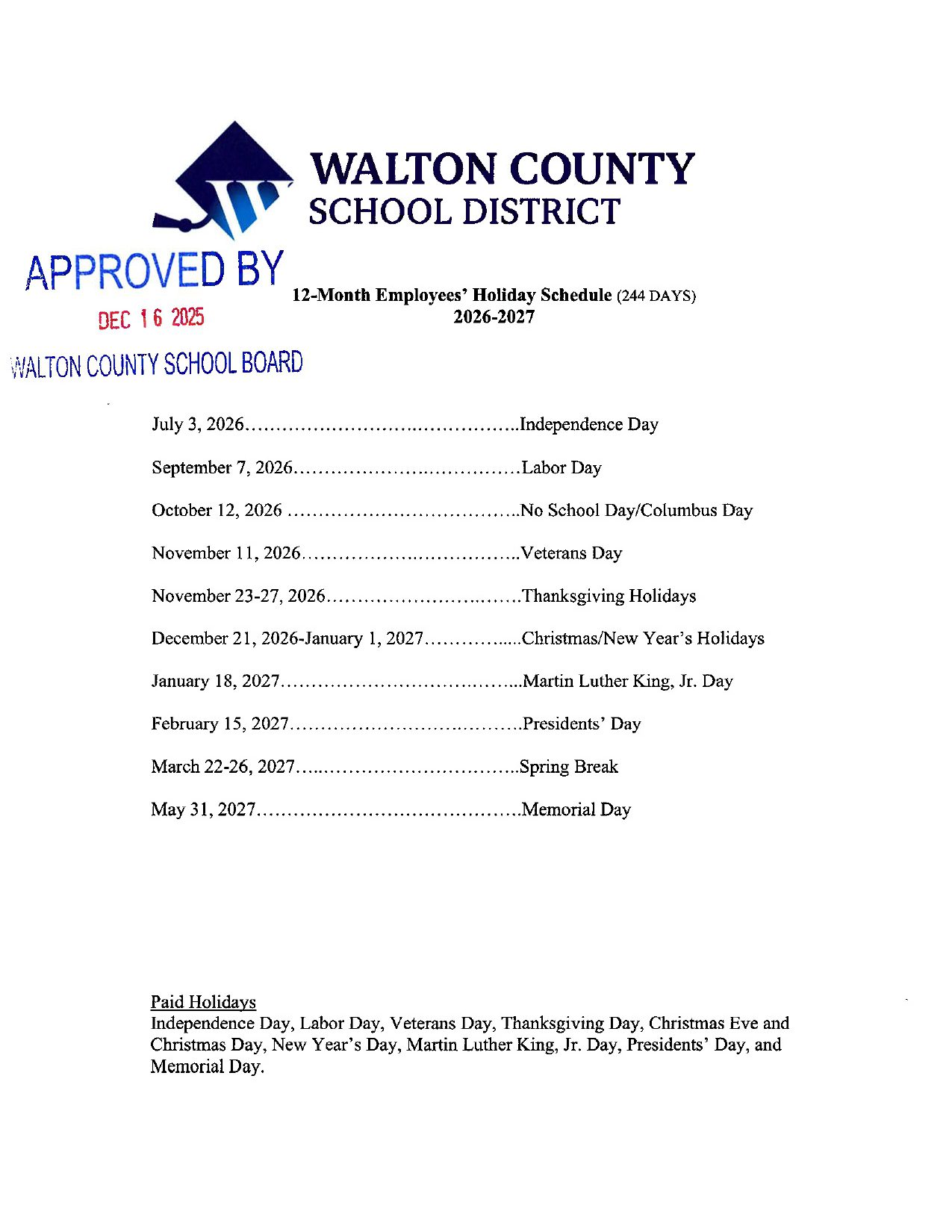 Dates are sourced from the official Walton County School District FL 26-27 Calendar [PDF] website. Dates may change at the discretion of the district. Always verify with the official school website for the latest updates.