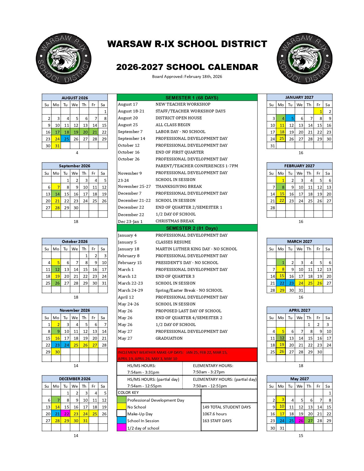 WARSAW R-IX SCHOOL DISTRICT Calendar (2026-2027)