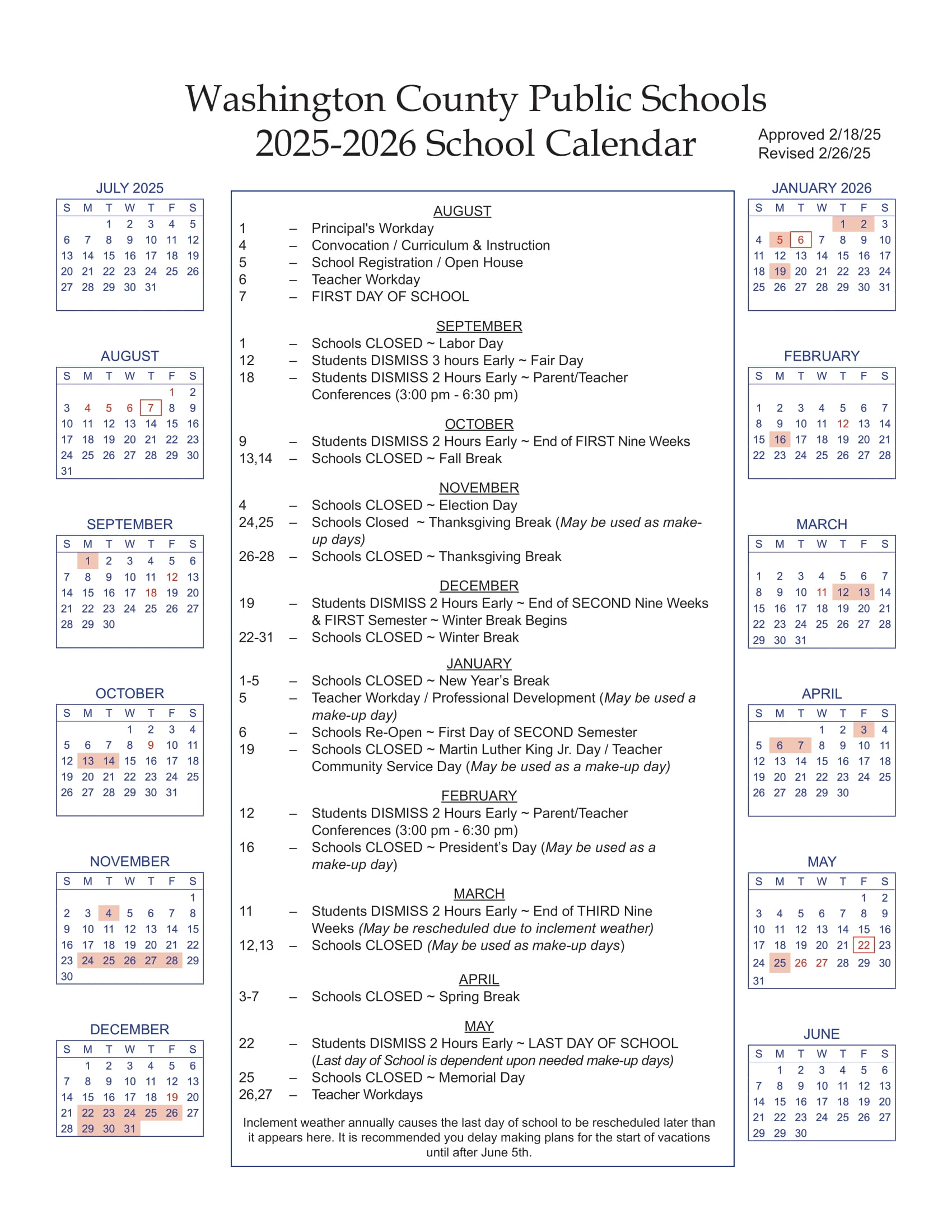 Washington County Public Schools 2025-2026 Calendar FAQs