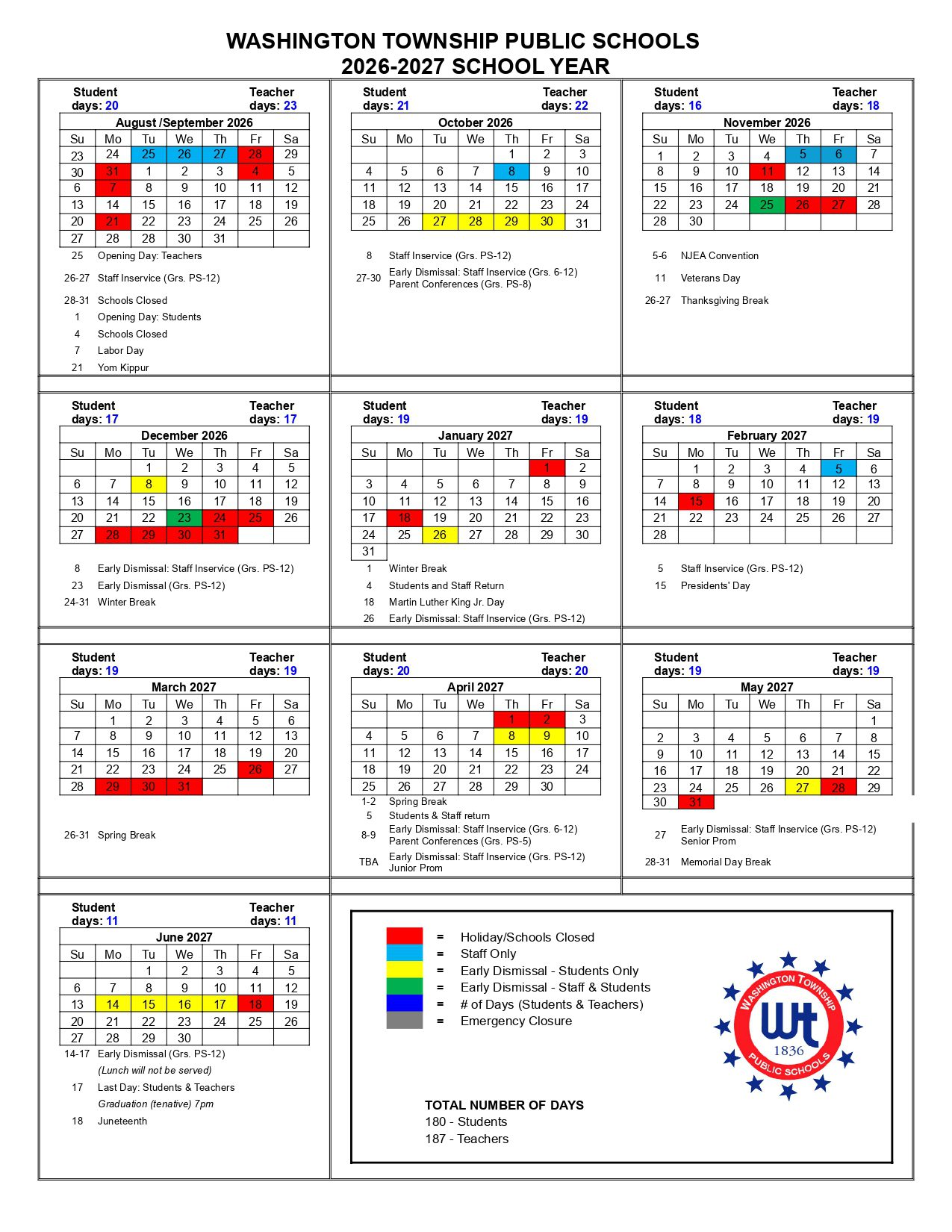 Washington Township Public Schools Calendar 2026-2027