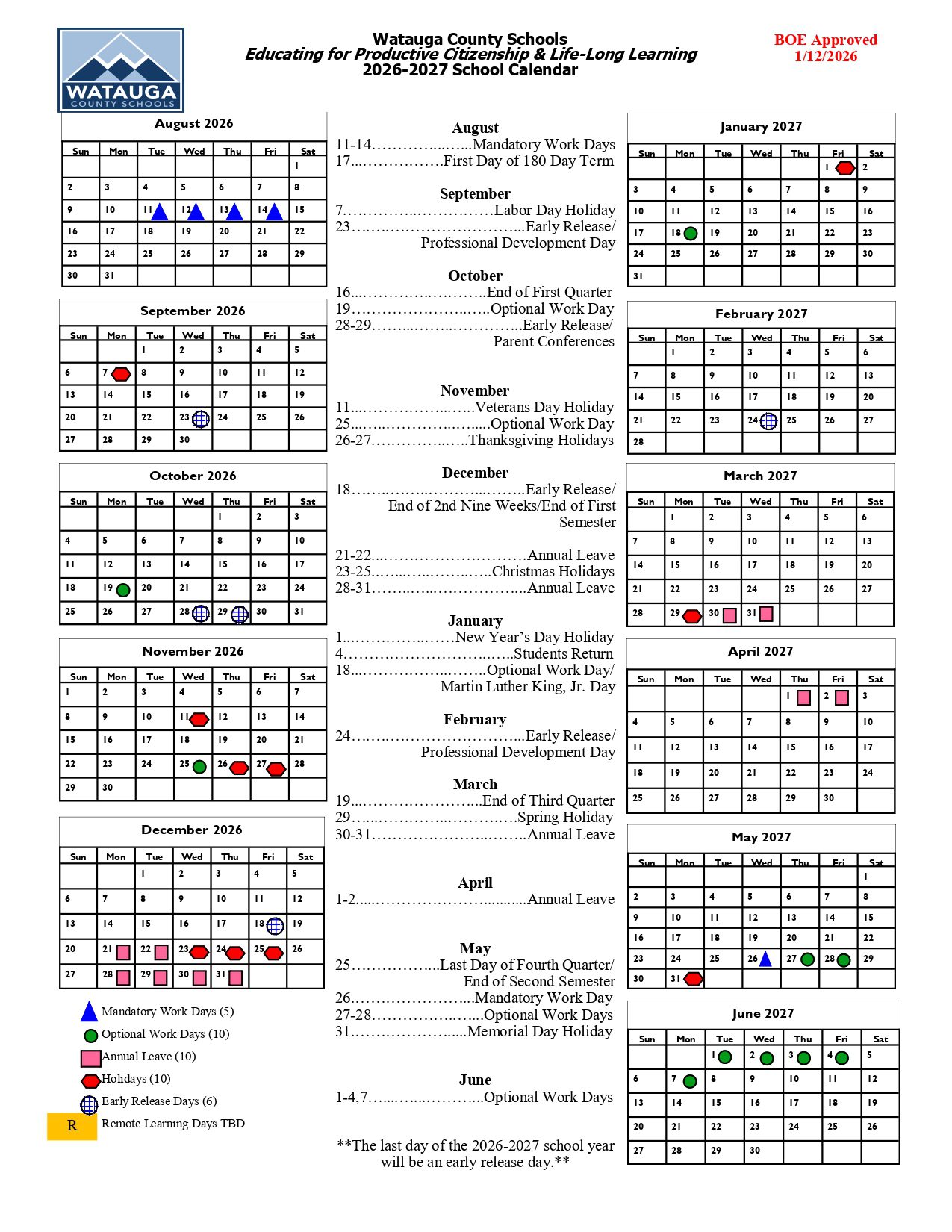 Dates are sourced from the official Watauga County Schools Calendar 26-27 [PDF] website. Dates may change at the discretion of the district. Always verify with the official school website for the latest updates.