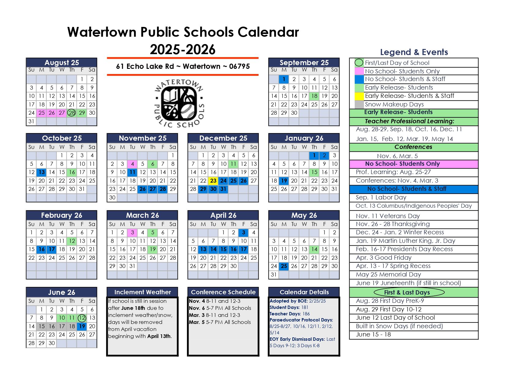 Watertown Public Schools Calendar (2025-2026)