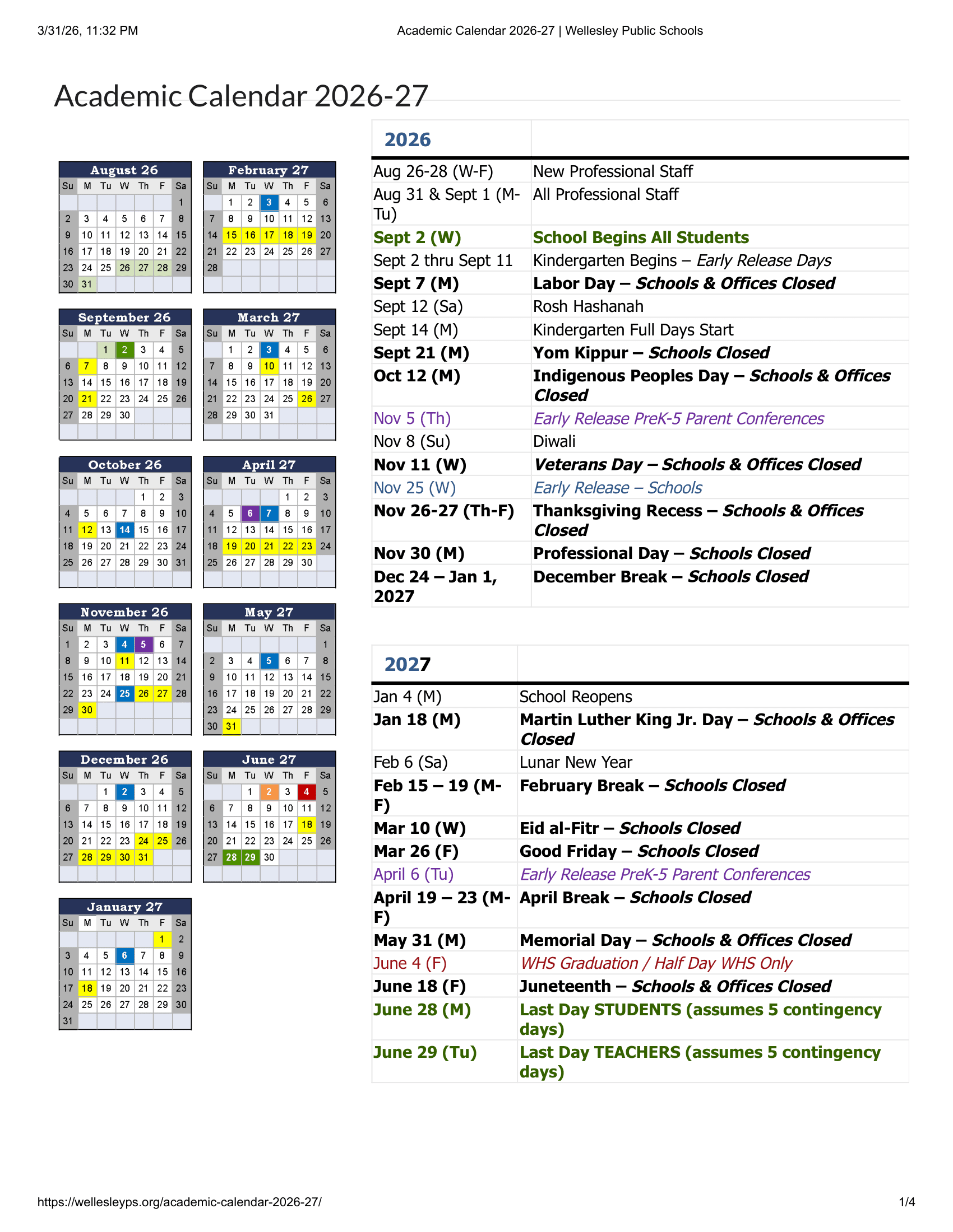 Dates are sourced from the official Wellesley Public Schools 26-27 Calendar [PDF] website. Dates may change at the discretion of the district. Always verify with the official school website for the latest updates.