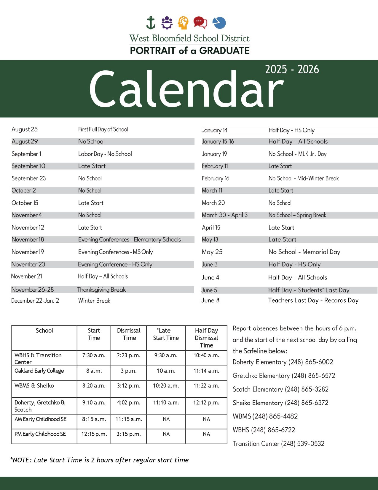Late start days are on September 10, 2025, October 15, 2025, November 12, 2025, February 11, 2026, March 11, 2026, April 15, 2026, and May 13, 2026.