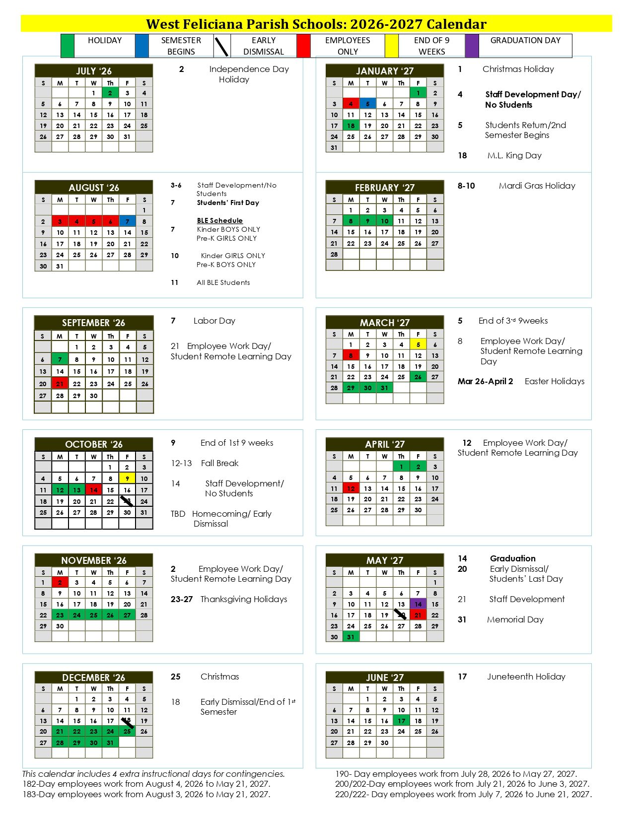 Dates are sourced from the official West Feliciana Parish Schools Calendar 26-27 Revised [PDF] website. Dates may change at the discretion of the district. Always verify with the official school website for the latest updates.
