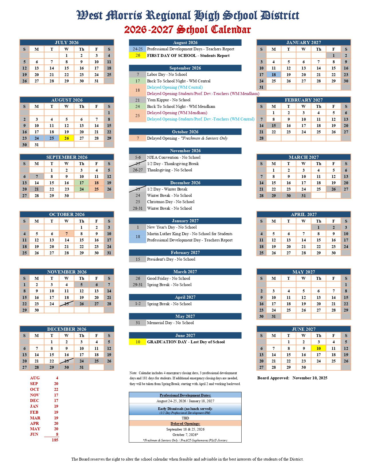 The Printable school calendar provided on this page is taken from the official West Morris Regional High School District NJ Calendar 26-27 Updates. Please note that all dates and events are subject to change at the discretion of the school district. For the most accurate and updated information, please refer to the official district website or contact the school helpline.