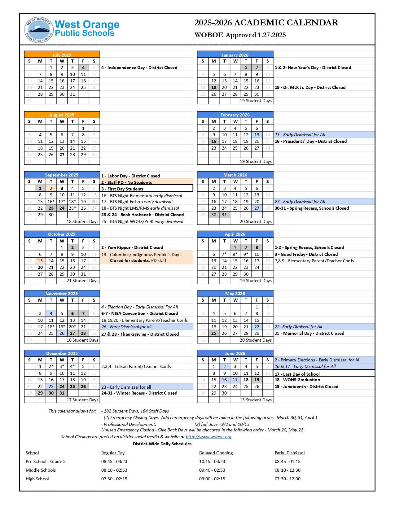 West Orange Public Schools 2025-2026 Calendar FAQ