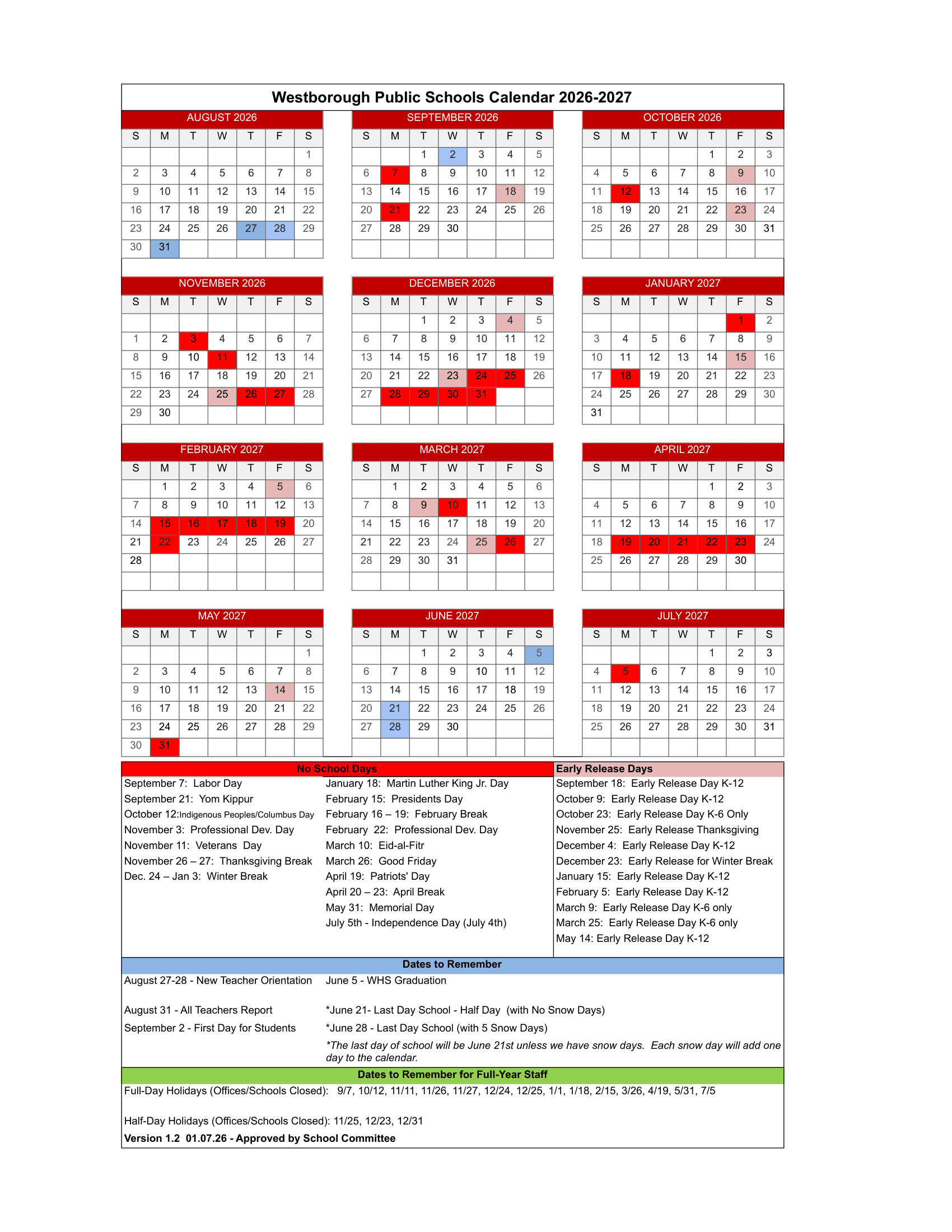 Dates are sourced from the official Westborough Public Schools 26-27 Calendar [PDF] website. Dates may change at the discretion of the district. Always verify with the official school website for the latest updates.