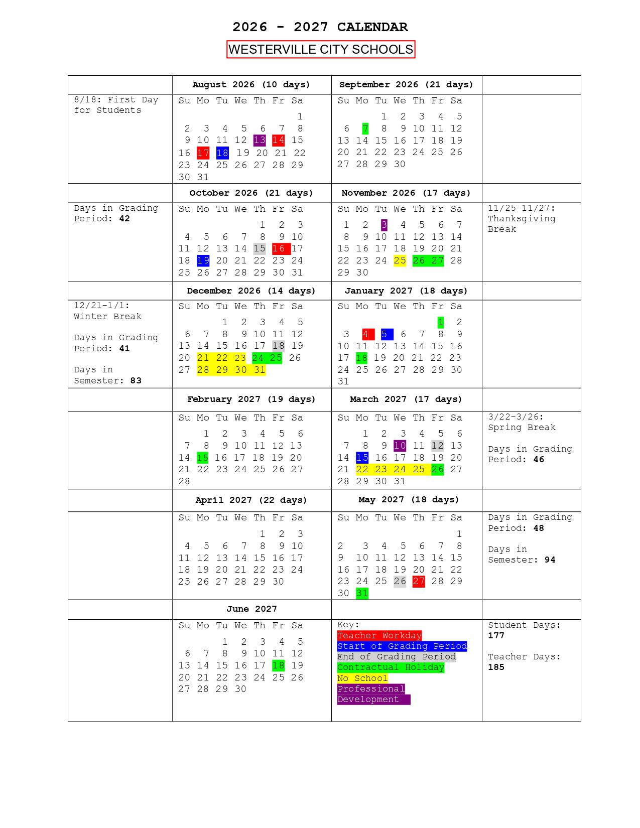 Dates are sourced from the official Westerville City Schools OH Calendar 26-27 Updates website. Dates may change at the discretion of the district. Always verify with the official school website for the latest updates.
