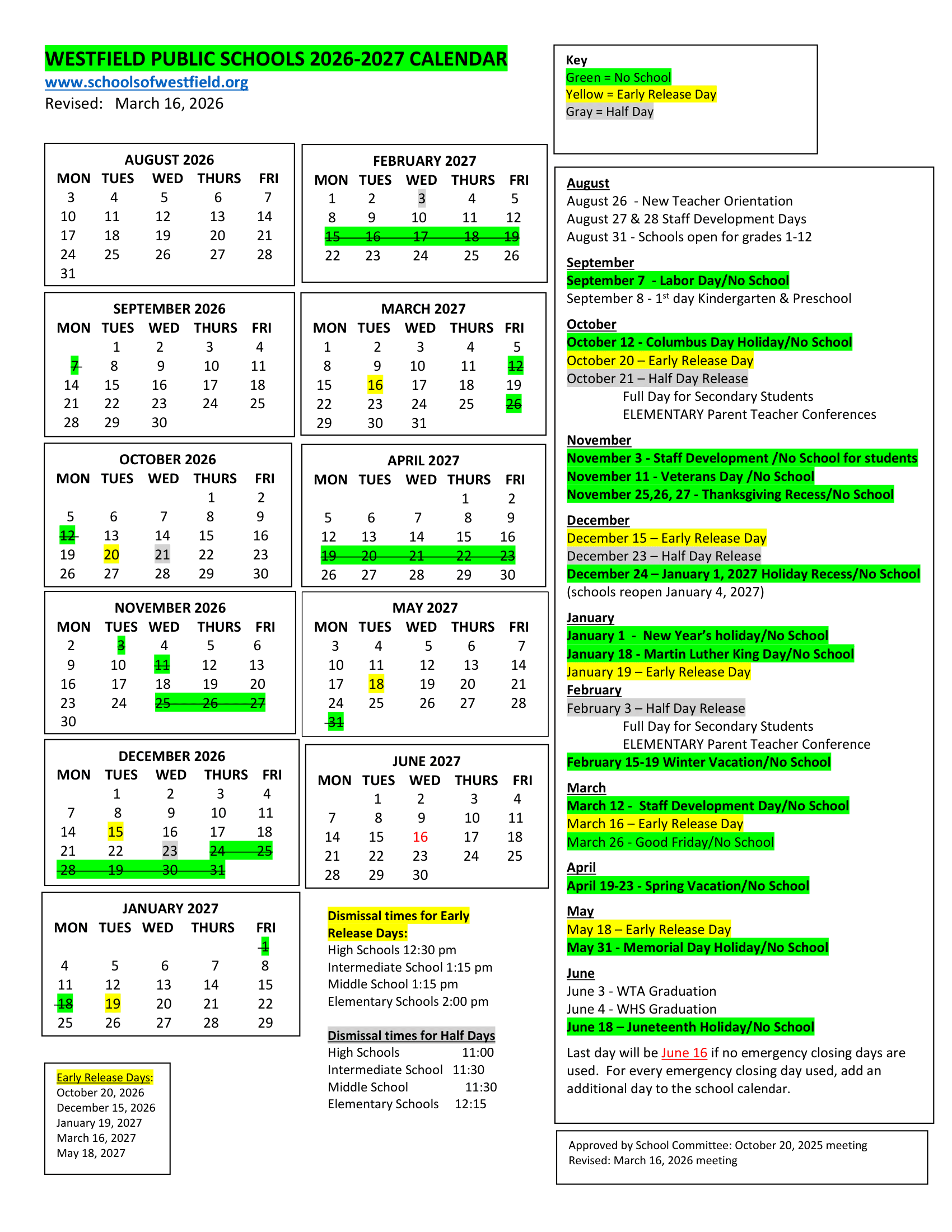 Dates are sourced from the official Westfield Public Schools MA 26-27 Calendar [PDF] website. Dates may change at the discretion of the district. Always verify with the official school website for the latest updates.
