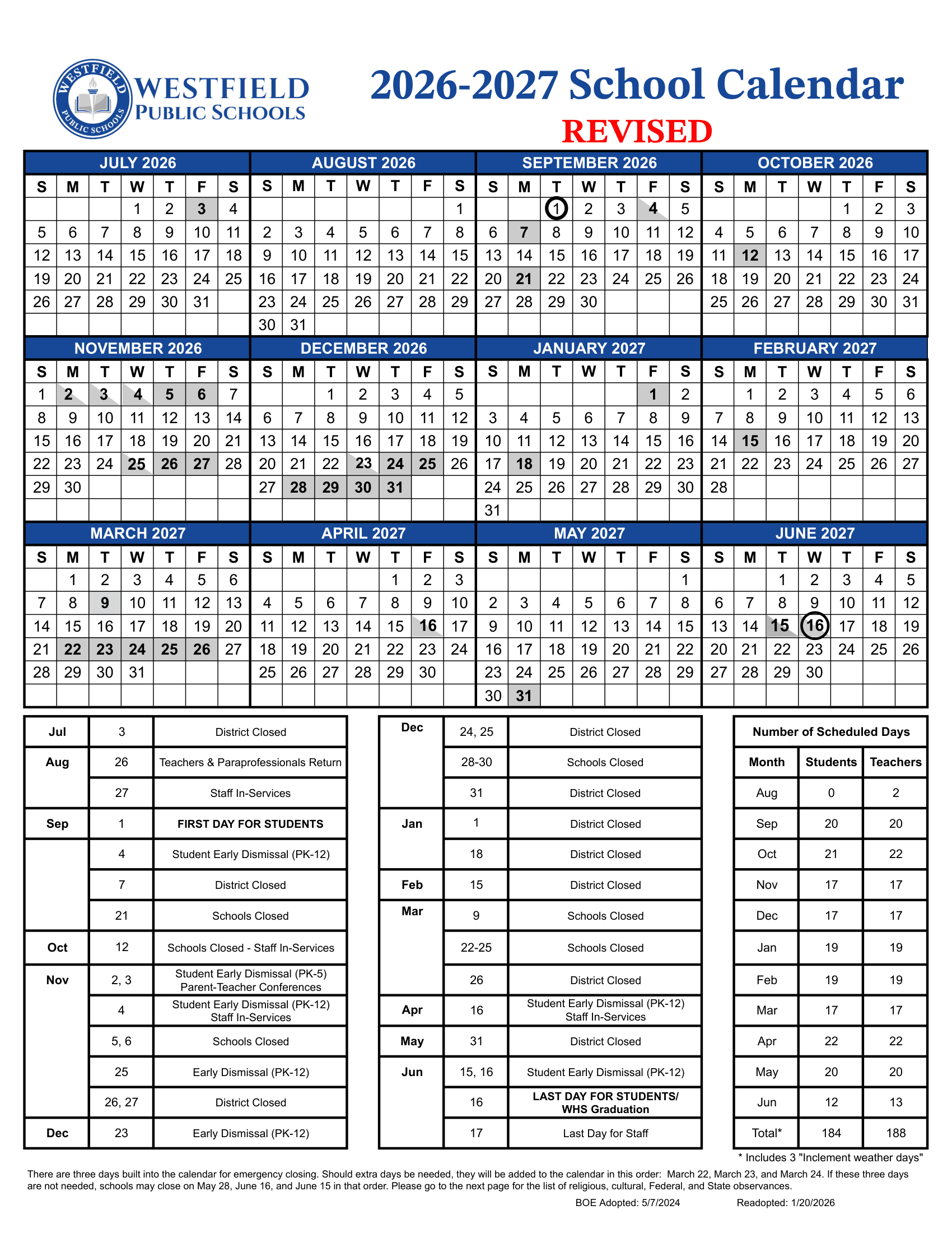 Dates are sourced from the official Westfield Public Schools NJ Calendar 26-27 Revised [pdf] website. Dates may change at the discretion of the district. Always verify with the official school website for the latest updates.