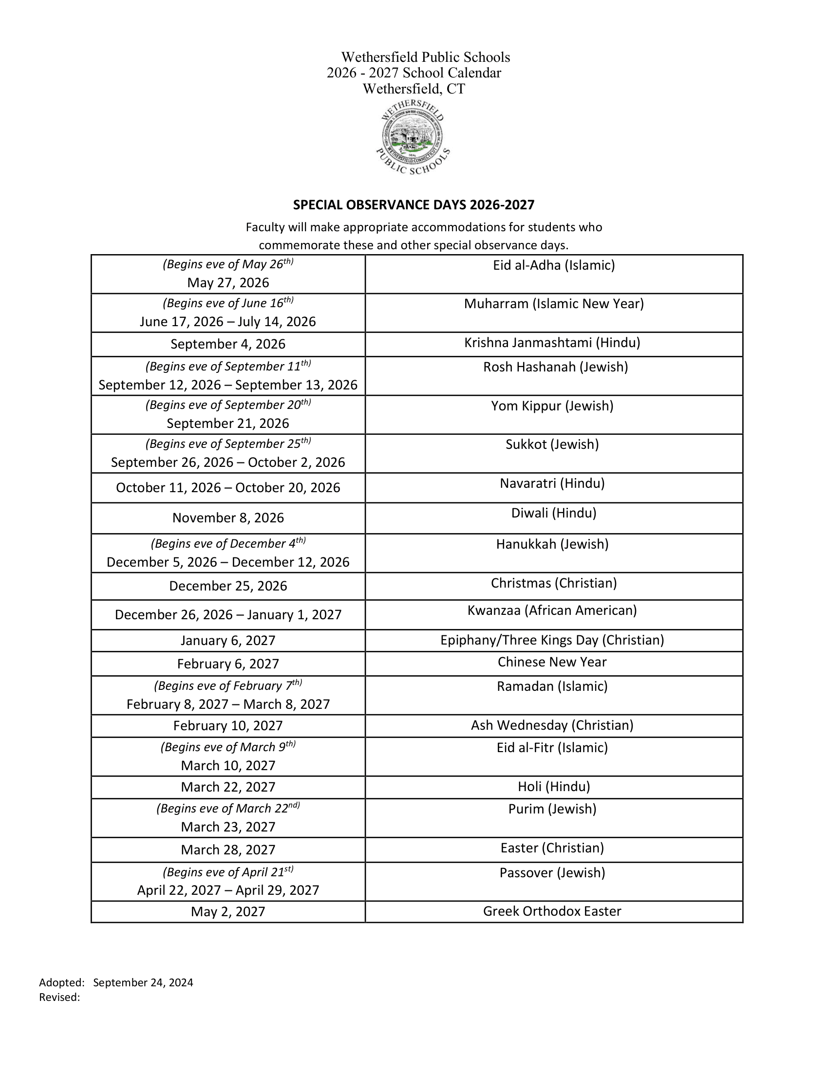 Dates are sourced from the official Wethersfield Public Schools Calendar 26-27 Updated [PDF] website. Dates may change at the discretion of the district. Always verify with the official school website for the latest updates.