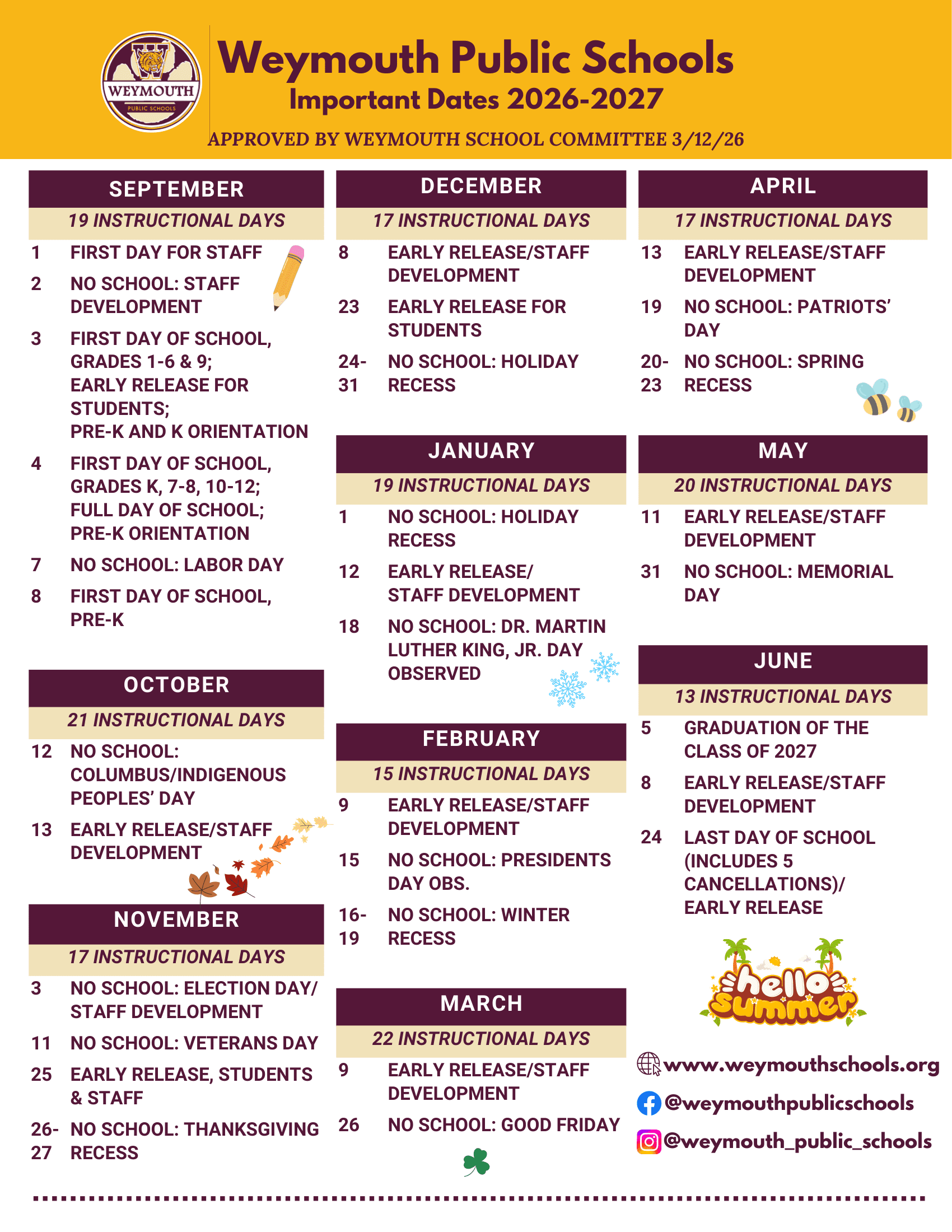 Dates are sourced from the official Weymouth Public Schools MA 26-27 Calendar [PDF] website. Dates may change at the discretion of the district. Always verify with the official school website for the latest updates.