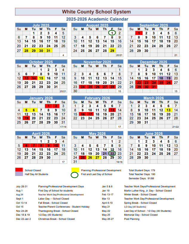 White County School System Calendar (2025-2026)