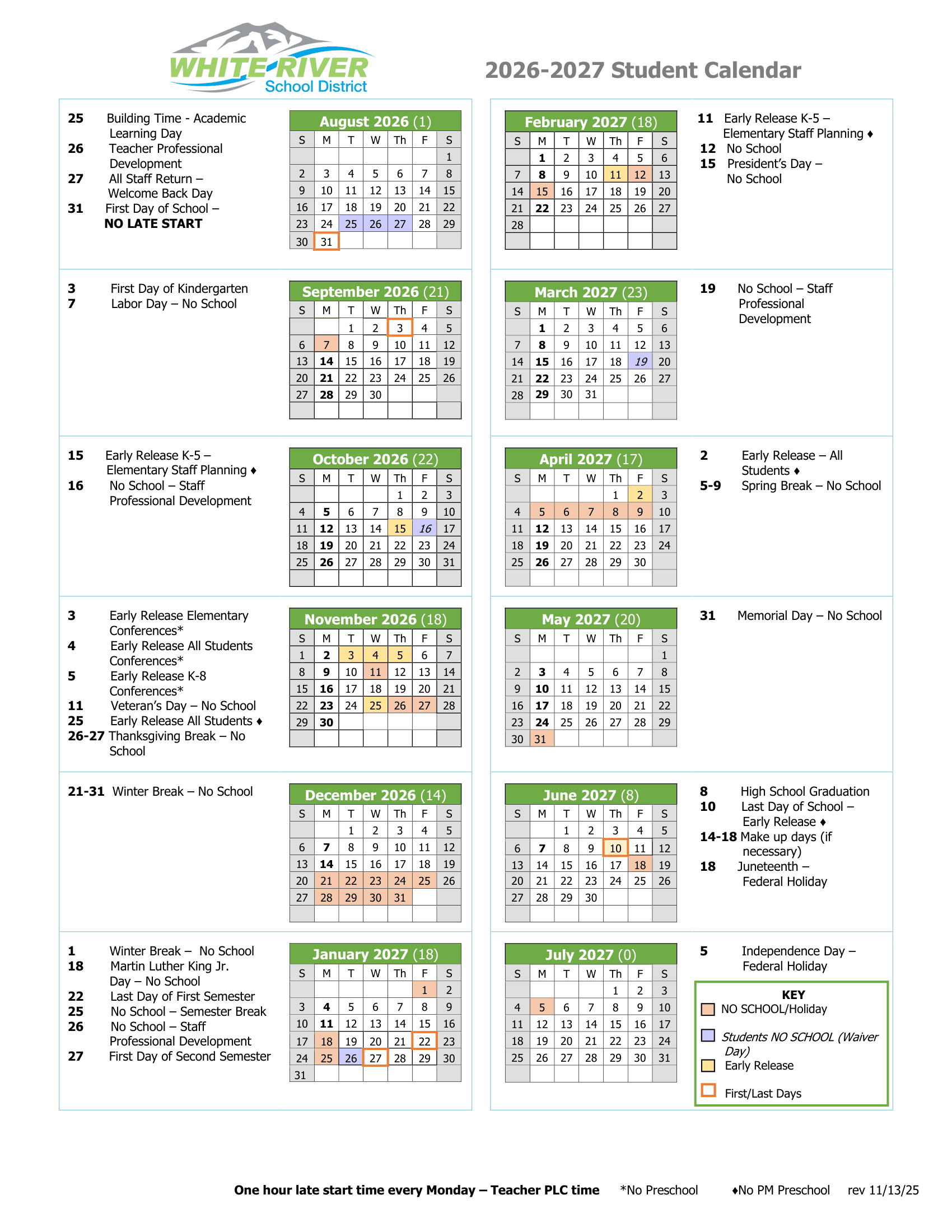Dates are sourced from the official White River School District Calendar 26-27 [PDF] Revised website. Dates may change at the discretion of the district. Always verify with the official school website for the latest updates.