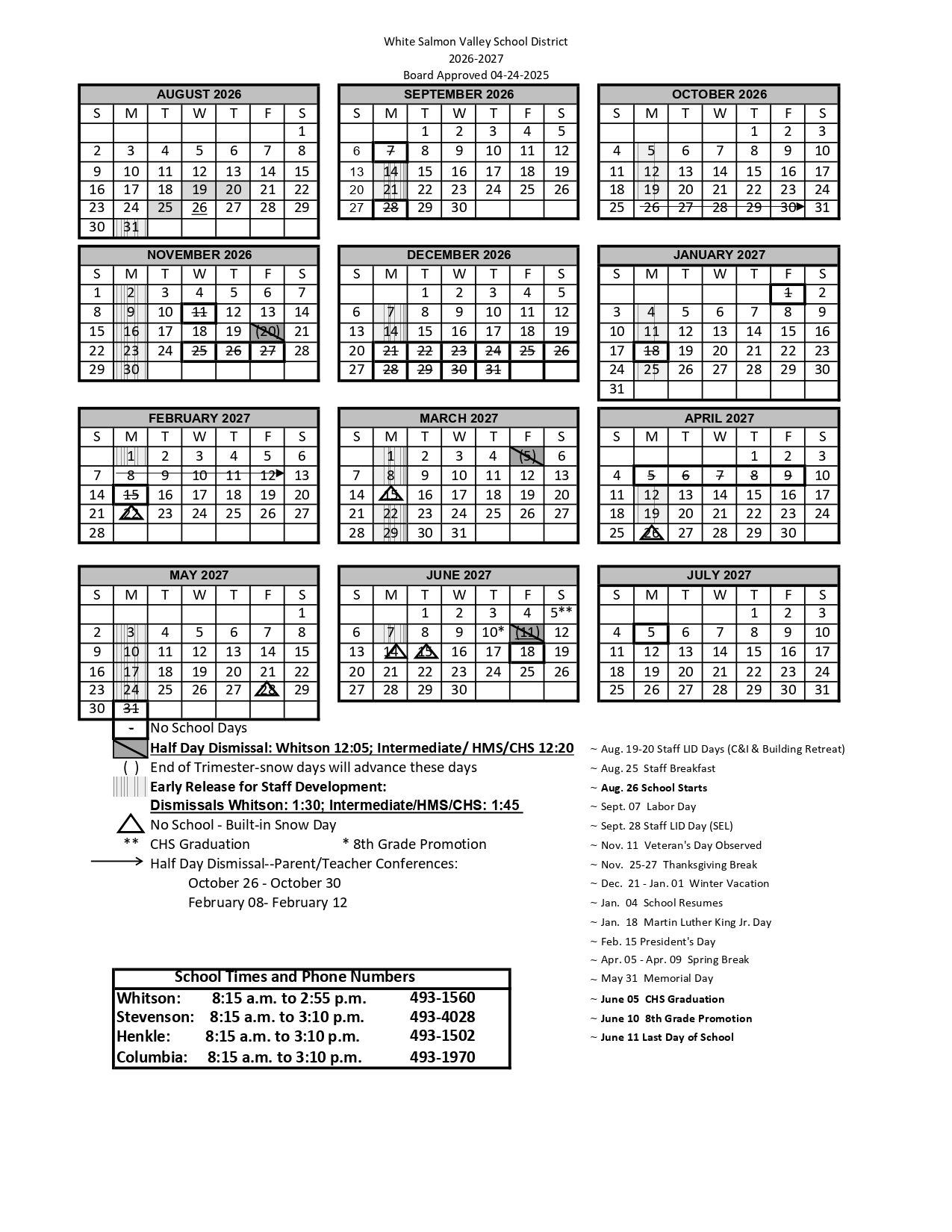White Salmon Valley School District Calendar (2026-2027)