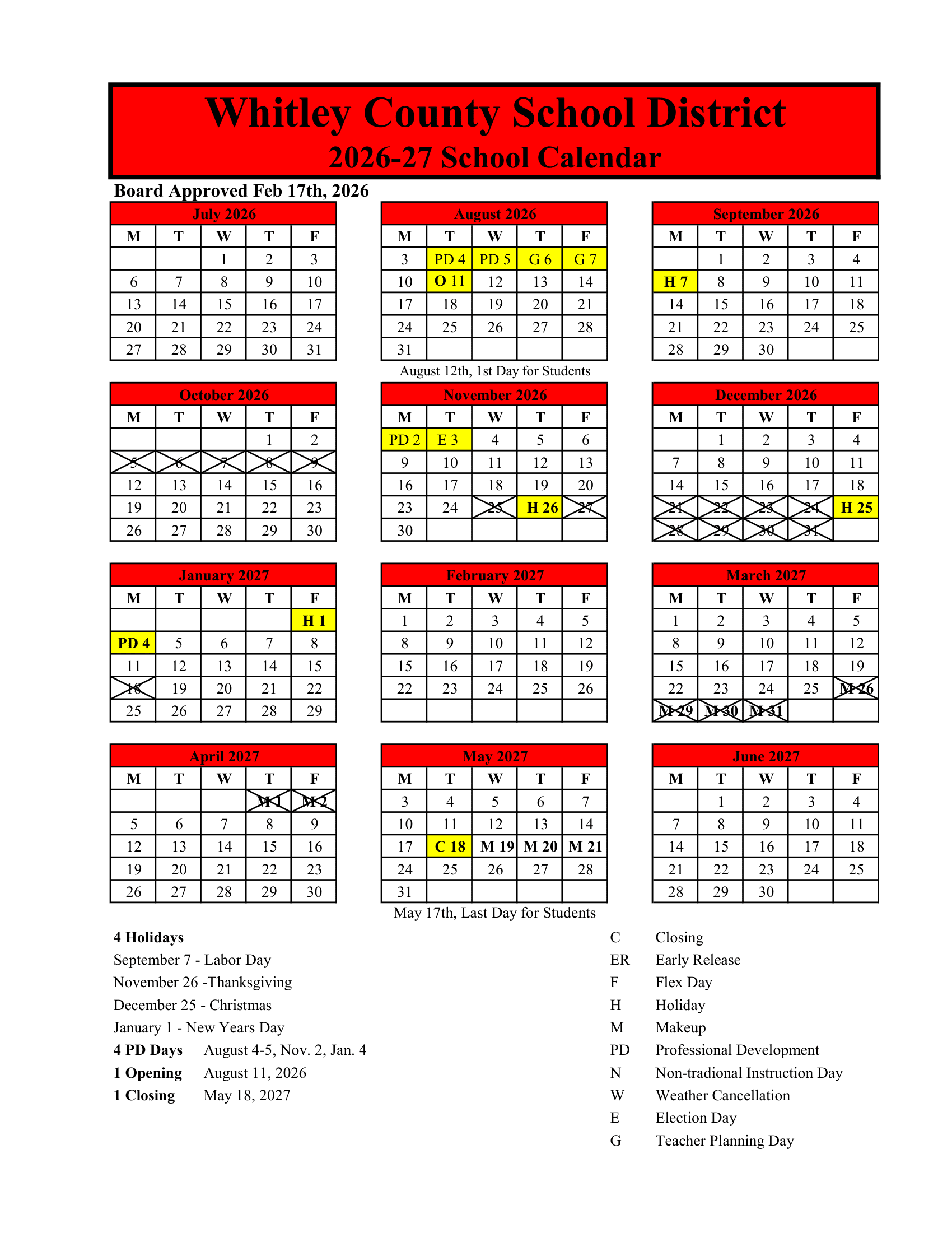 The Printable school calendar provided on this page is taken from the official Whitley County School District Calendar 26-27 Updates. Please note that all dates and events are subject to change at the discretion of the school district. For the most accurate and updated information, please refer to the official district website or contact the school helpline.