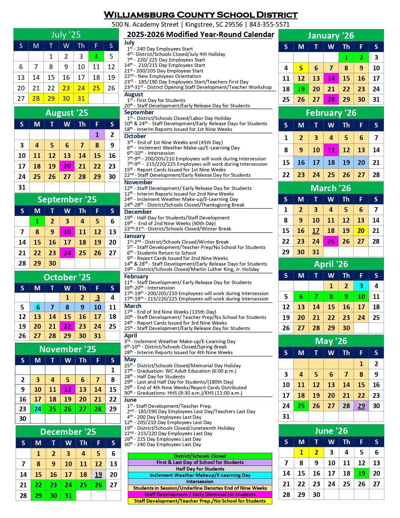 WILLIAMSBURG COUNTY SCHOOL DISTRICT Calendar (2025-2026)