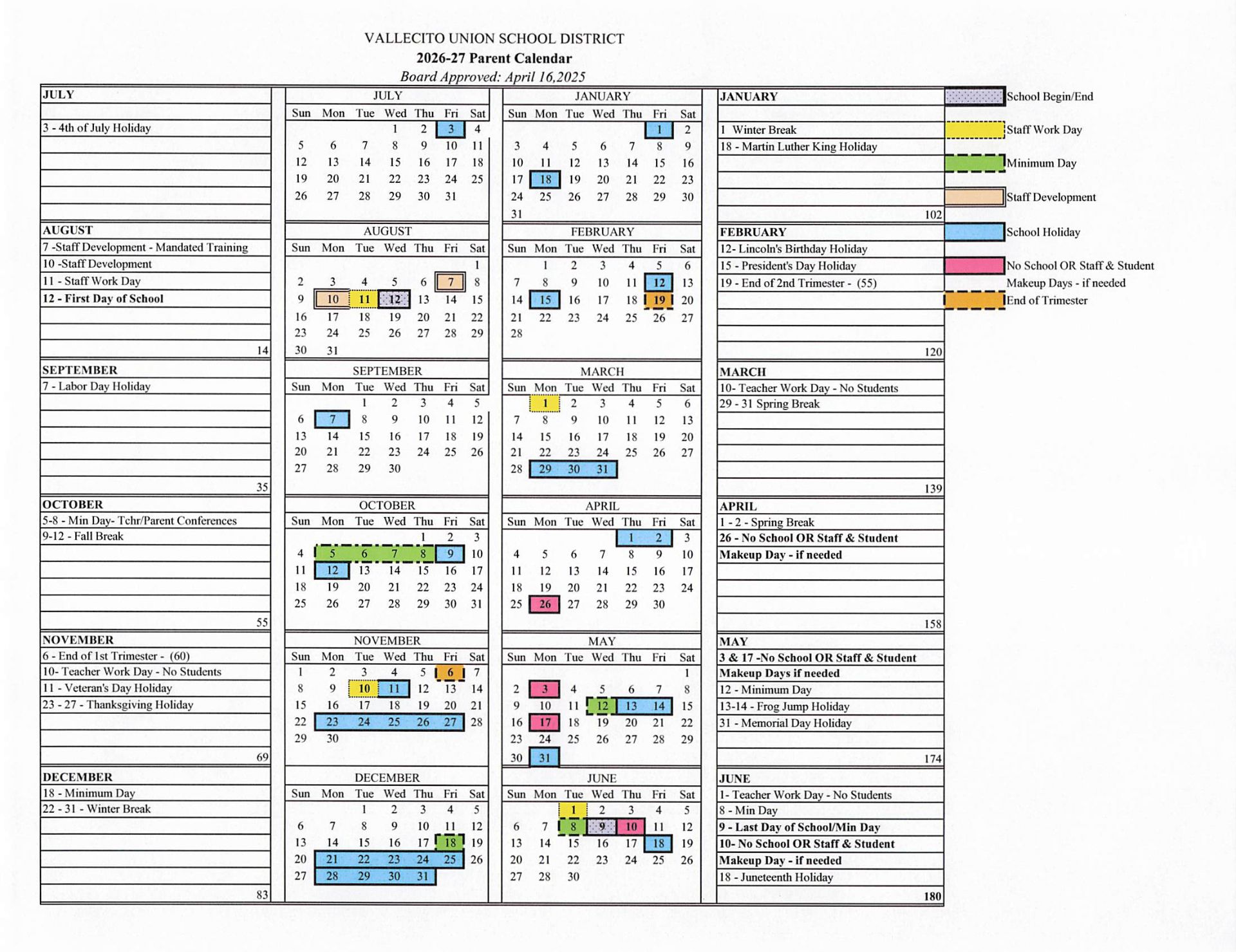 The school Term Dates shown on this page has been sourced directly from the official Williams Unified School District 26-27 Calendar (Updated) website. Please be aware that all dates and events may be amended at the discretion of the school, state, District or County. For the most up-to-date and accurate information, we recommend checking the official council website or contacting the school office.