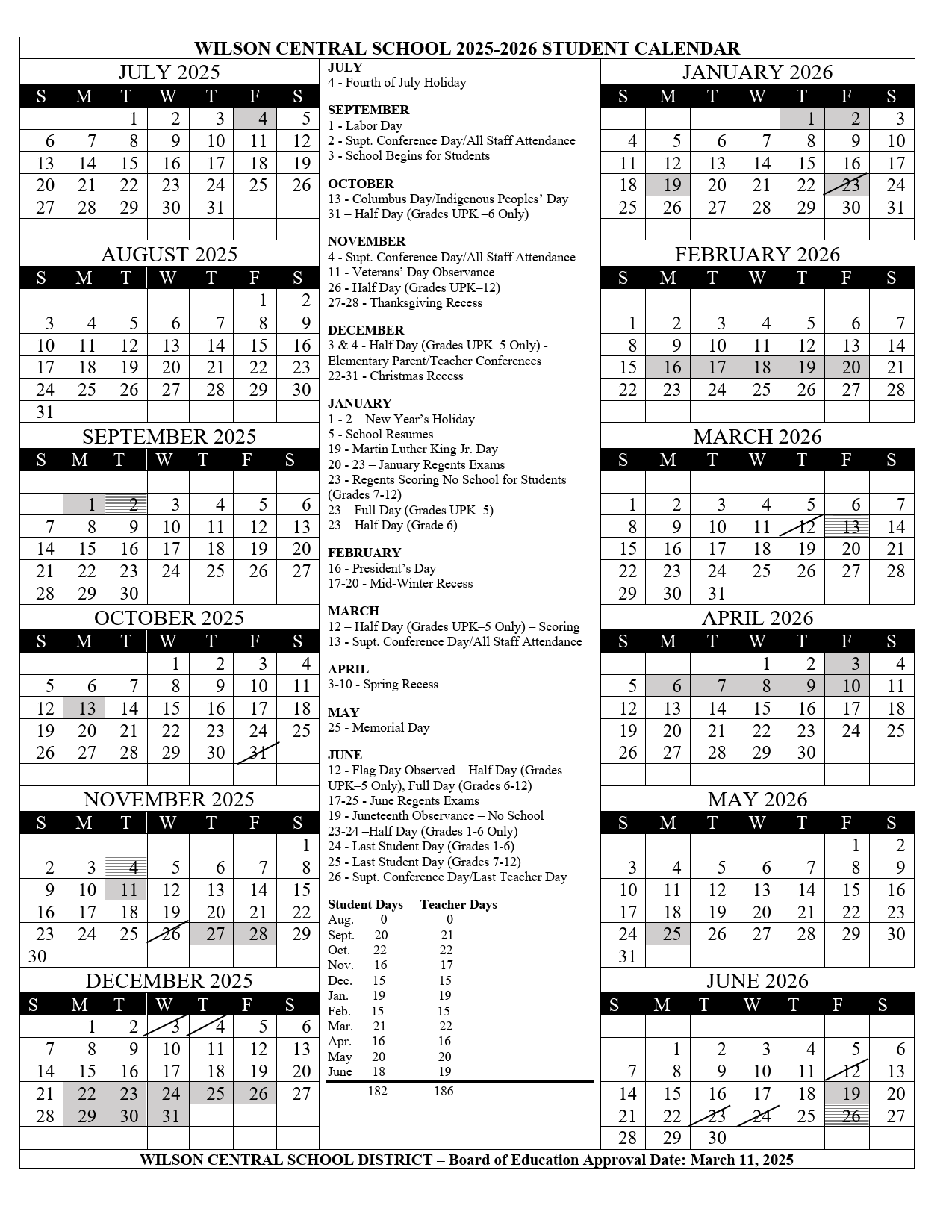The school calendar provided on this page is taken from the official Wilson Central School Calendar District website. Please note that all dates and events are subject to change at the discretion of the school district. For the most accurate and updated information, please refer to the official district website or contact the school helpline.