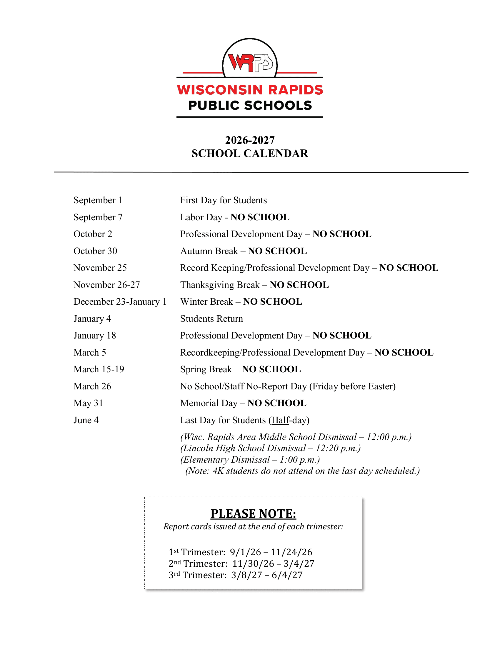 Dates are sourced from the official Wisconsin Rapids Public Schools District 26-27 Updates website. Dates may change at the discretion of the district. Always verify with the official school website for the latest updates.