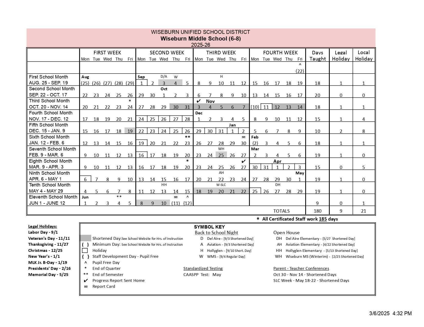 The school calendar provided on this page is taken from the official Wiseburn Unified School District website. Please note that all dates and events are subject to change at the discretion of the school district. For the most accurate and updated information, please refer to the official district website or contact the school helpline.