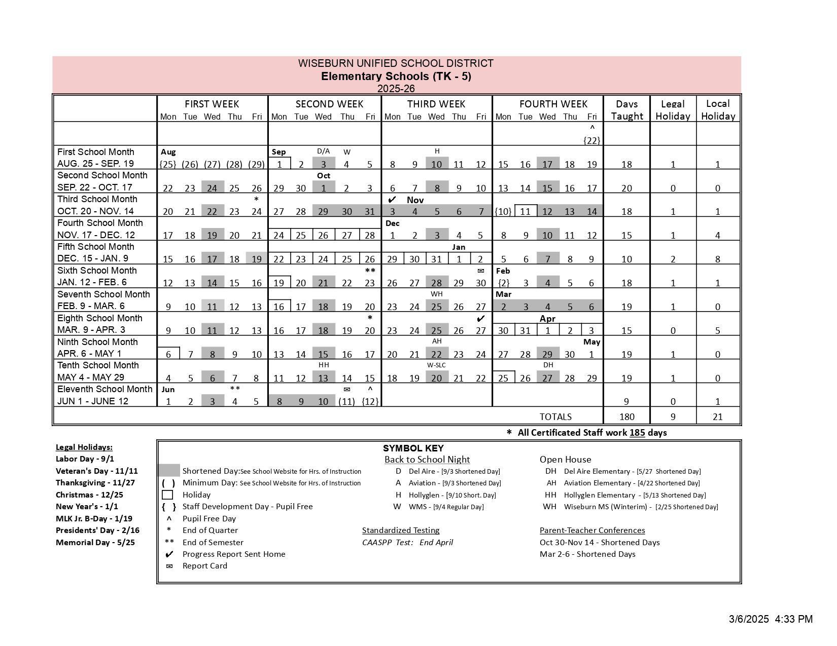 Wiseburn Unified School District Elementary Schools (TK-5) Calendar (2025-2026)