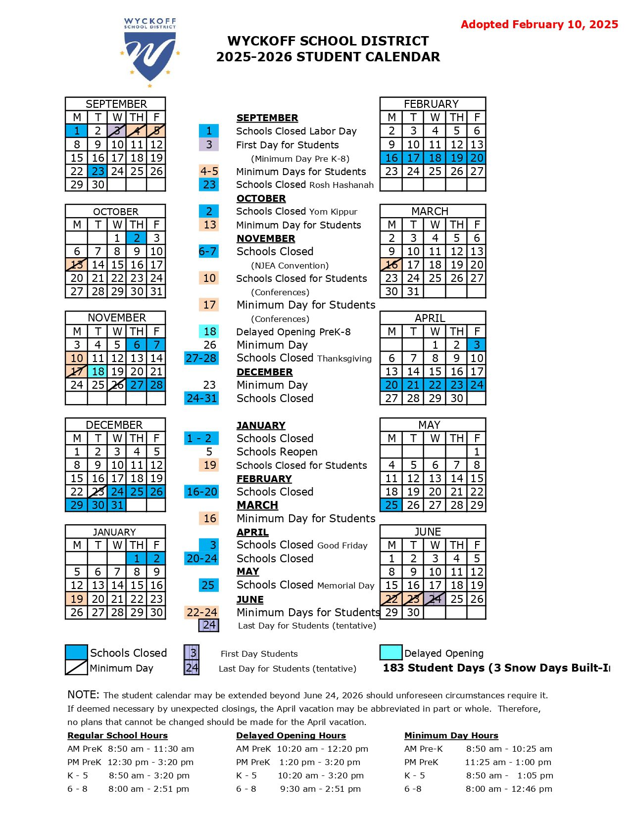 WYCKOFF SCHOOL DISTRICT Schools Calendar (2025-2026)
