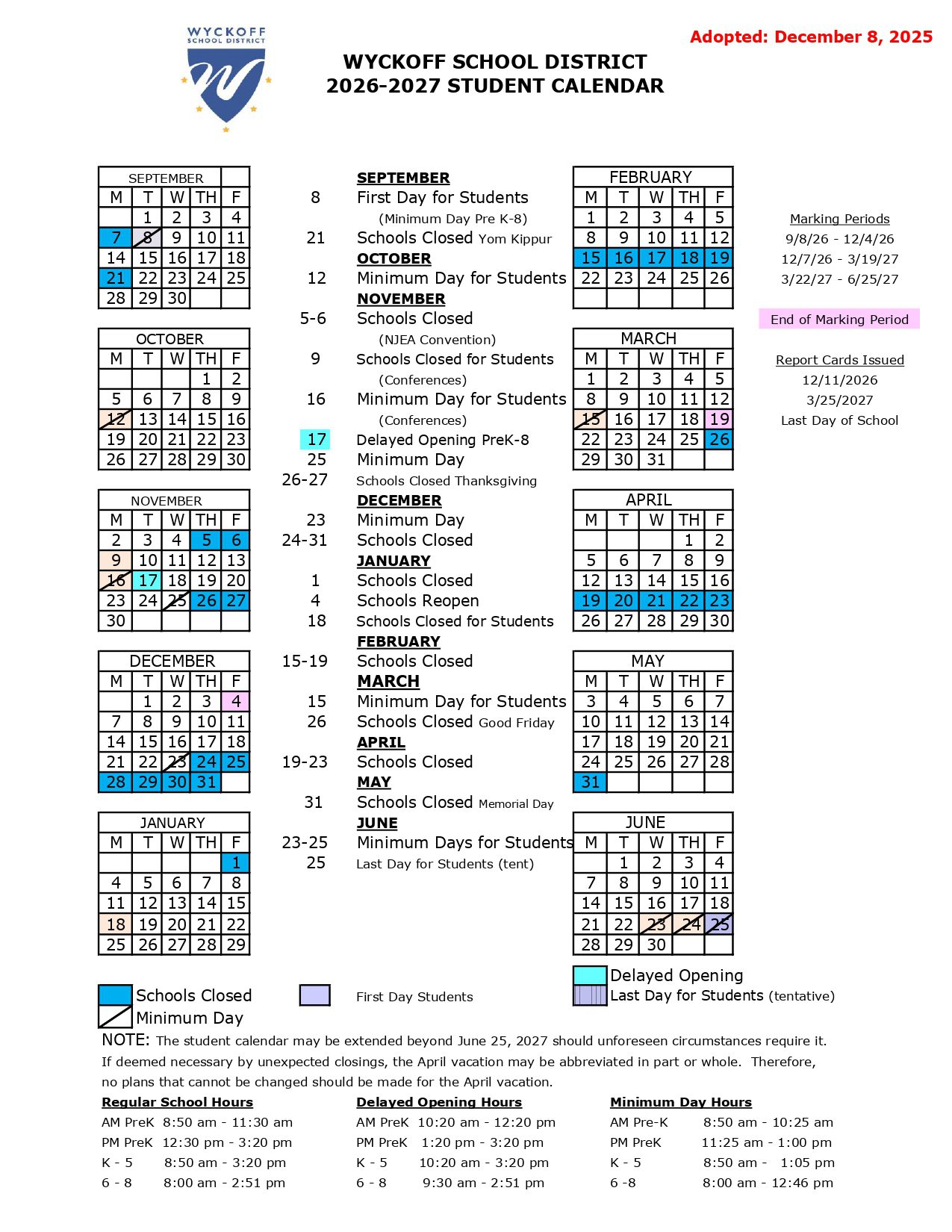 WYCKOFF SCHOOL DISTRICT NJ Calendar 26-27 Updates