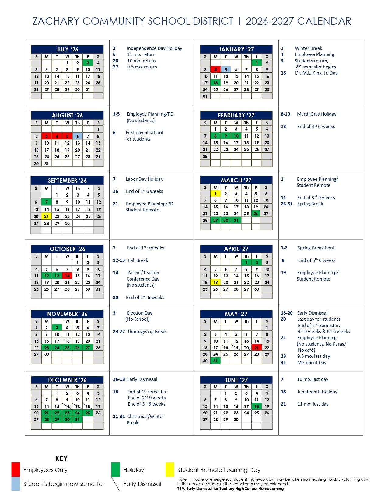 Dates are sourced from the official Zachary Community School District Calendar 26-27 Revised [PDF] website. Dates may change at the discretion of the district. Always verify with the official school website for the latest updates.