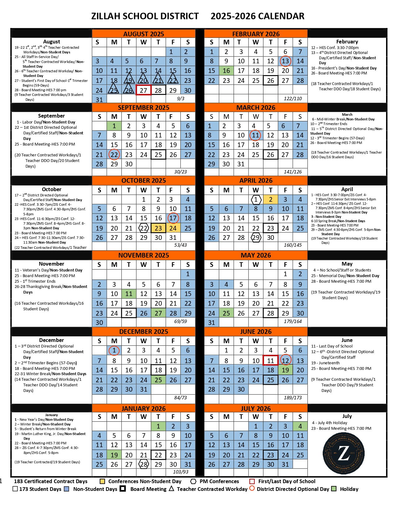 ZILLAH SCHOOL DISTRICT Calendar (2025-2026)